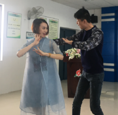 讲座最后,罗艳还邀请了一些观众上台来学习简单的昆曲身段,开门、推门、关门、返回等动作一一分解教授给他们,还现场教授了“皂罗袍”的表演身段。会场观众不禁都起立跟着一起学起来。
