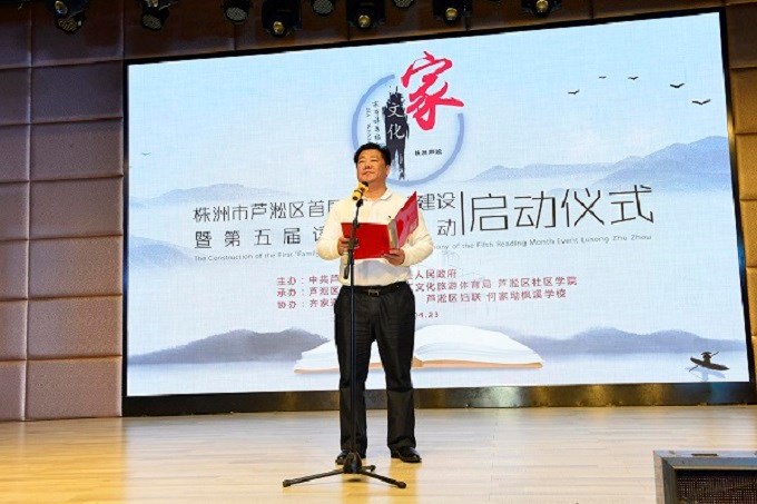 芦淞区委副书记蒋峰讲话并宣布活动开幕。他指出,同时启动“家文化”建设与读书月活动,就是为了深入推进全民阅读,倡导市民以读书为乐,以读书修身,以读书长才,以好家风促进好党风、好政风、好民风;他强调,今年要扎实抓好“家文化”建设的“12345”工程,让坚持终身学习、传承家风美德在全区上下蔚然成风,努力形成全员参与、上下联动、同频共振的浓厚氛围,以文化人、凝心聚力,共同建设富强时尚幸福新芦淞!