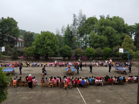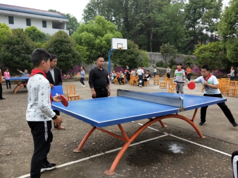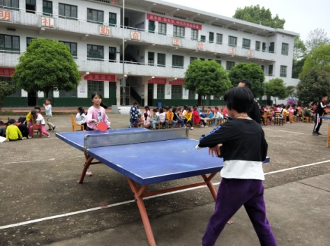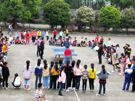 4月22日下午第1节课后,排上小学的全体师生在少先队辅导员黄老师的组织下,在学校玫红色的映山红环抱的操场上,开展了一场活泼有趣的乒乓球比赛。