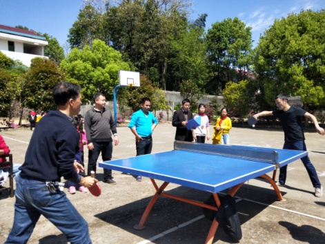 这次活泼有趣的乒乓球赛,参赛人数是213人。分两个环节,一个环节是从4月15日至4月22日上午进行的是教师淘汏后循环赛。男教师冠军是肖建飞老师,女教师冠军是胡淑兰老师。