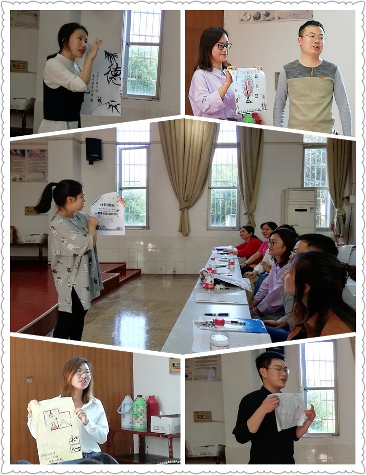全班分为五个小组,第一组包括一中数、理、化、生、体、信息等学科的老师,组长是颜涛老师;第二组由一中语、英、政、史、地、音、美及其他学科的老师组成,由陈宇铭老师任组长;第三组是五中数、理、化、生几个学科的老师,组长由刘宁辉老师担任;龙萍老师任组长的第四组是五中的语、英、政、史四个学科的老师;胡晓老师是第五组组长,他的组员来自五中地、音、体、美 、信息、心理等学科。五位组长在研修活动上分别展示了各自所在组制作的组文化海报并做了生动详细的解说。