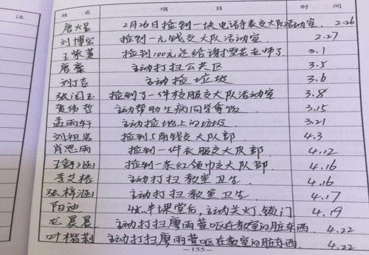 其中,一2中队辅导员张乐意老师、一3中队辅导员徐佳艳老师、一4中队辅导员徐慕甲老师、二1中队辅导员徐丽萍老师、二2中队辅导员汤英老师、二4中队辅导员张梦玲老师、二5中队辅导员辜一帆老师、三4中队辅导员刘琳老师、四2中队辅导员老师、四3中队辅导员朱惠秀老师、五1中队辅导员傅宇璐老师、五3中队辅导员陈钟阳老师、六2中队辅导员言丹老师、六3中队辅导员袁梦云老师、六5中队辅导员何丹老师,工作细致、记载详实、真情表露无遗!