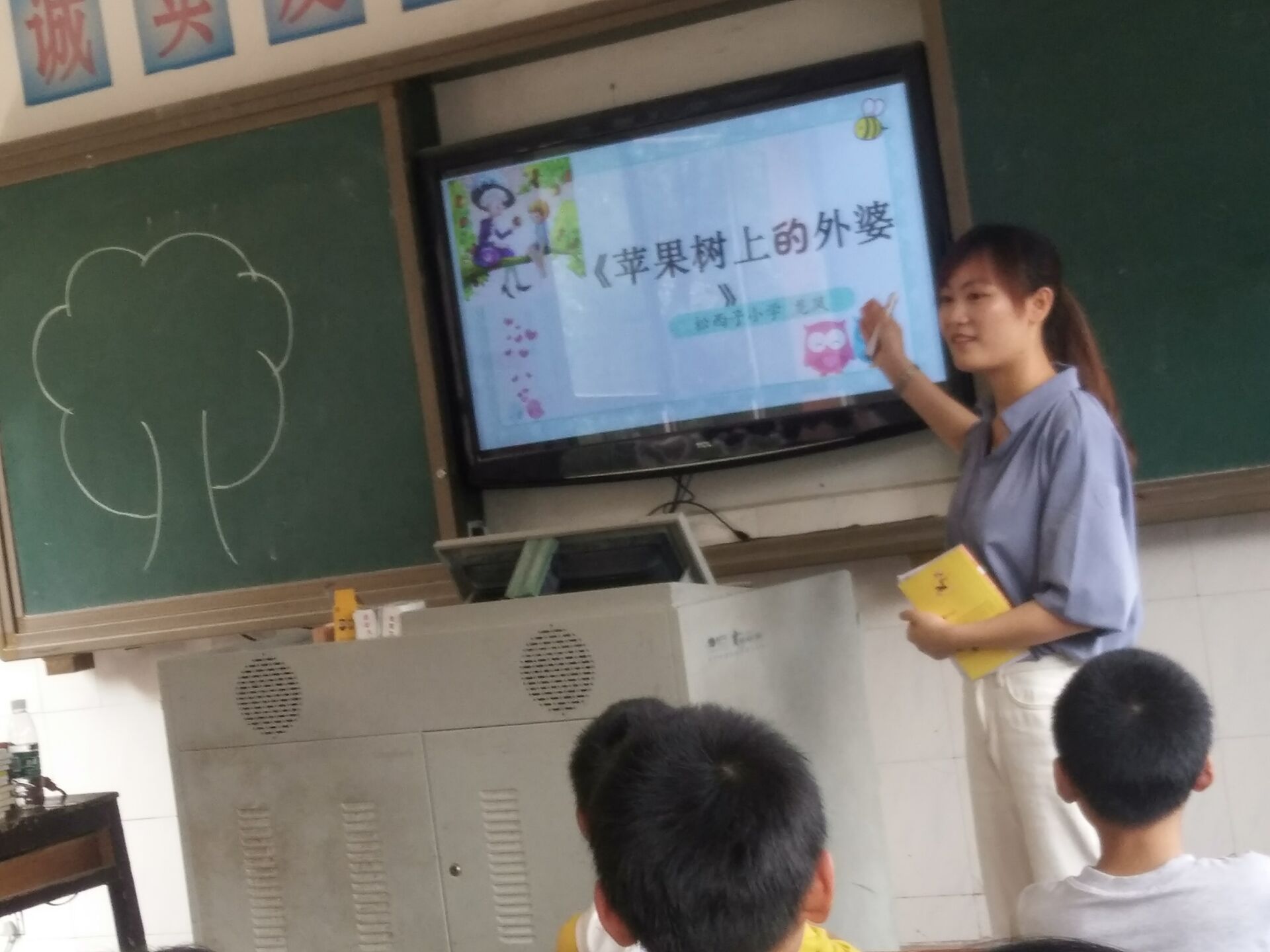 紧接着,第二节童话导读课《苹果树上的外婆》是由松西子小学龙凤老师执教的,沉稳干练的龙老师引导三年级的孩子们,通过"读书名,猜故事;看封面,知作者;看目录,猜情节;看插图,知精彩"这四种指导读书的方法,让孩子跟随着她对《苹果树上的外婆》产生了浓厚的阅读兴趣,真正做到了授之以渔,让孩子感受到了苹果树上的外婆神奇的能力。