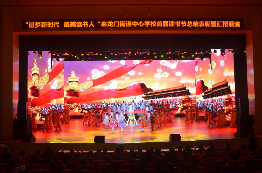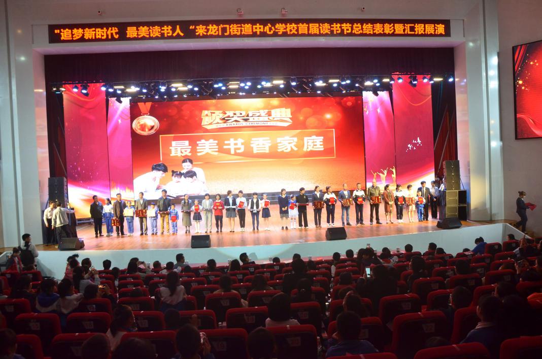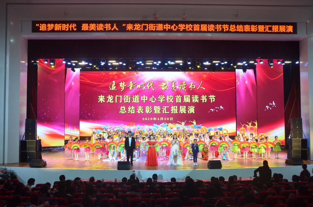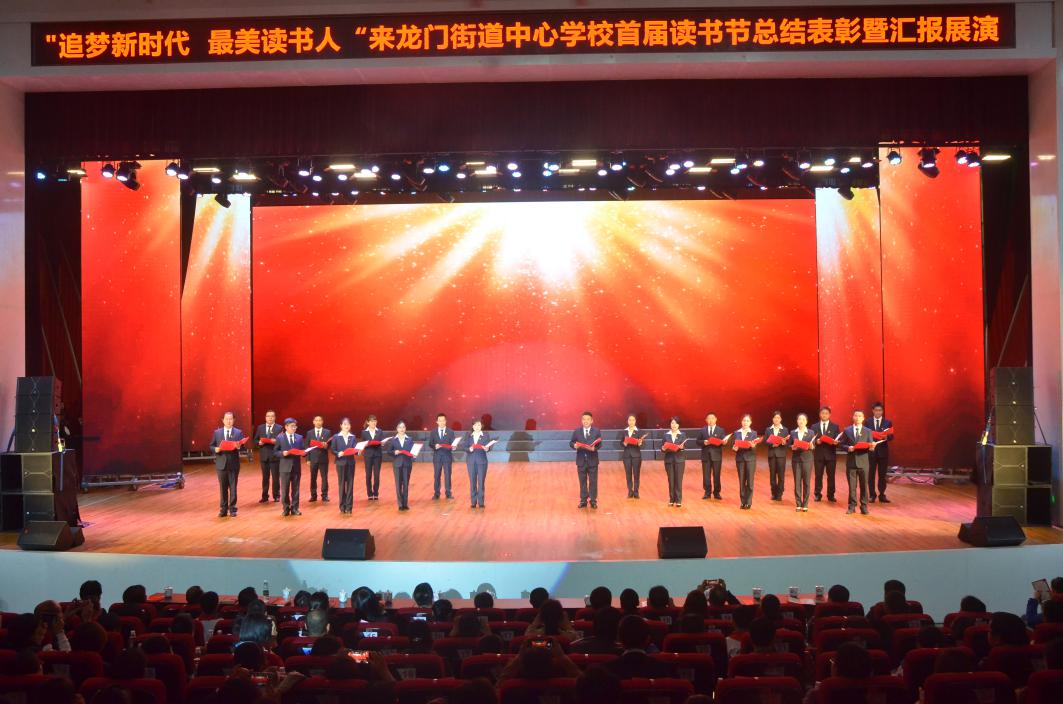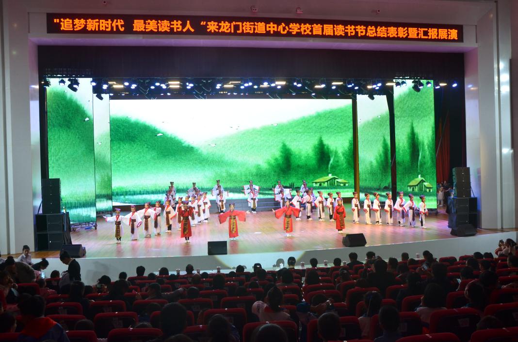 本届读书节总结表彰暨汇报展演活动形式多样、内容丰富多彩,有诗词朗诵、诵读与表演、舞蹈、花球啦啦操、经典古诗词歌曲演唱、大型歌舞……精彩绝伦!您瞧,渌江中学《为了孩子们的微笑》的诗朗诵真实再现了辛勤耕耘在教育教学第一线的来龙门教育人,披着星星和朝露上班,带着月色与疲惫回家,早来晚走无怨无悔,用青春和生命谱写了一曲又一曲园丁赞歌。中心幼儿园的小朋友们精彩演绎了《书声朗朗颂道德》。实验小学表演的古诗文诵读《诗韵》,让所有的观众一起品味中华诗词的韵美,真正感受到了圣贤"风波亭中,高歌尤在耳;半山揽月,热血沸神州。"的拳拳报国之情。狮子坡小学的师生们给大家带来的《让文明礼仪之花开满校园》精彩表演,让我们懂得从身边的小事做起,使文明无处不在、无时不在,和谐校园的文明之花才能永远盛开、绽放。东岸小学师生们带来的诵读表演《君子之道》,让我们徜徉在国学经典的氛围中,领略君子之道,淡而不厌、简而文、温而雅的深刻含义;而花球啦啦操《快乐的dancing》则用灵动诠释着运动的健美,充分展示了生活的阳光,用激情铺垫着精彩的人生!而上洲小学的同学们带来的舞蹈《妈妈是一本书》,则更加深刻了告诉我们母亲是一本书,有爱、有忧、有幸福、有辛酸,读不完、说不尽,需要我们用一生去品读;母亲是荷叶,为我们遮风挡雨;母亲是明灯,为我们点亮人生。丁家坊小学还表演了朗诵《少年中国说》,阐明中国少年肩负建设重任,号召和激励中国少年为创建少年中国而奋斗,热烈讴歌少年中国的光辉未来……。"唱支山歌给党听,我把党来比母亲,母亲只生了我的身,党的光辉照我心。"实验小学的同学们带来的大型歌舞《唱支山歌给党听》把首届读书节总结表彰暨汇报展演推向了高潮。