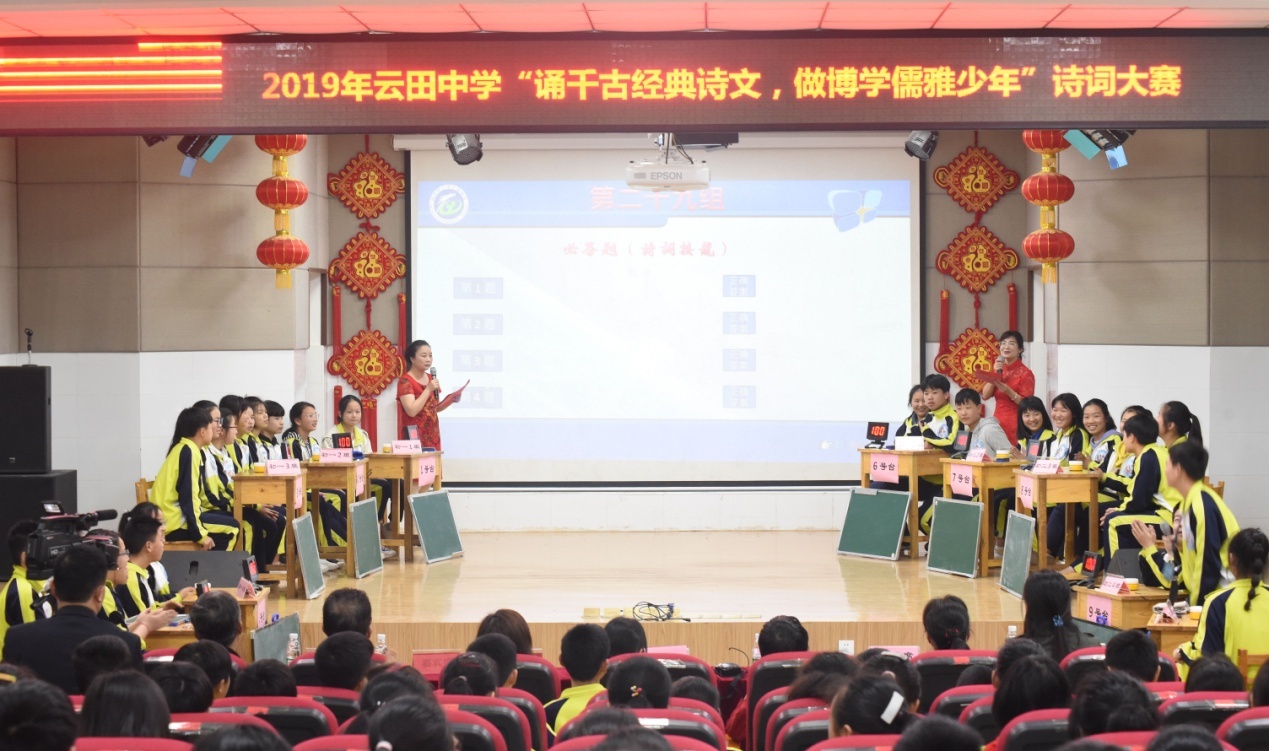 4月30日,云田中学组织开展读书节系列活动之"诵千古经典诗文,做博学儒雅少年"诗词大赛。大赛设诗词接龙、慧眼识珠、博学强识、风险题、诗词达人、现场观众答题等环节,题型包含必答题、抢答题、选答题,现场有4名点评老师。学校为了更好的组织好本次大赛,从2月份始,组织教师精选古诗词编撰成书,发放至学生手中,每天进行诵读,至4月末各班级进行初赛选派3名选手组成代表队参赛。经过紧张激烈的角逐,比赛结果评选出一等奖1队,二等奖2队,三等奖3队,从30名参赛选手中评选出4位诗词达人。