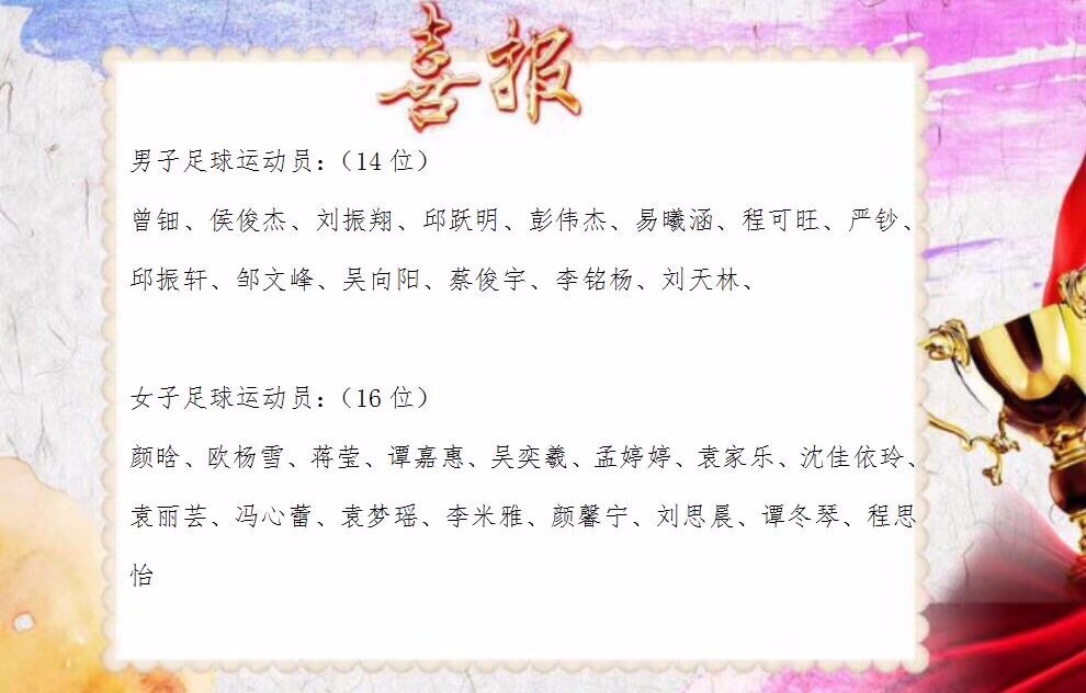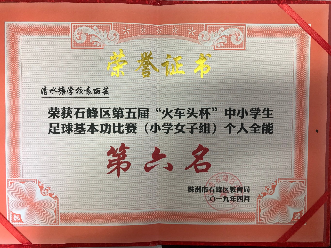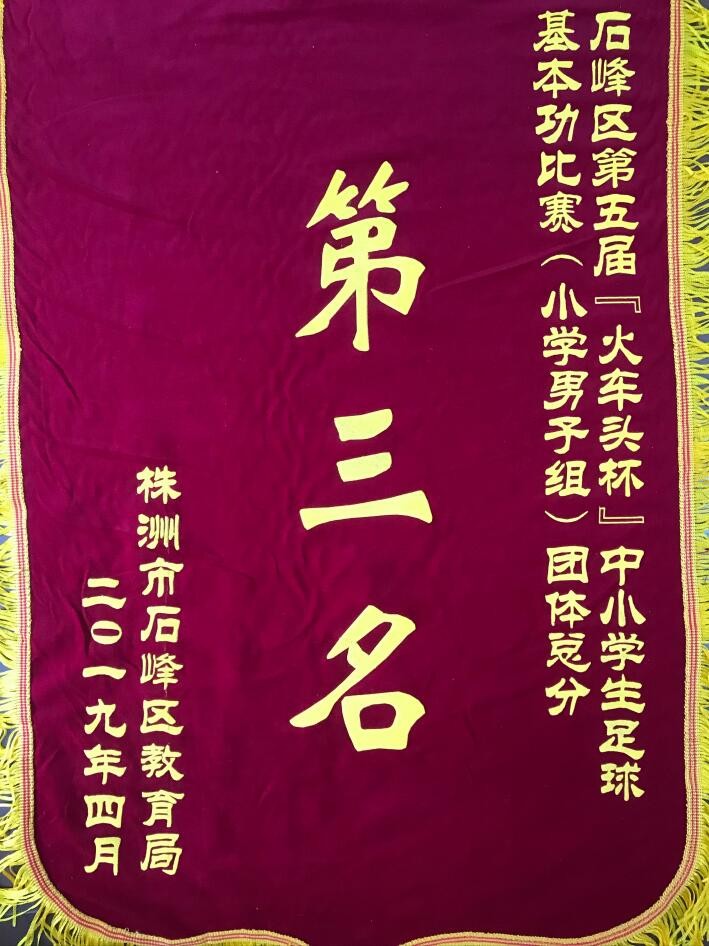 在石峰区第五届“火车头杯”中小学生足球比赛中,小学女子组:荣获足球比赛第二名、基本功比赛团体总分第二名;小学男子组:荣获足球比赛第三名、基本功比赛团体总分第三名;李宏斌老师荣获石峰区优秀指导老师奖;袁丽芸同学荣获基本功比赛个人全能第六名。