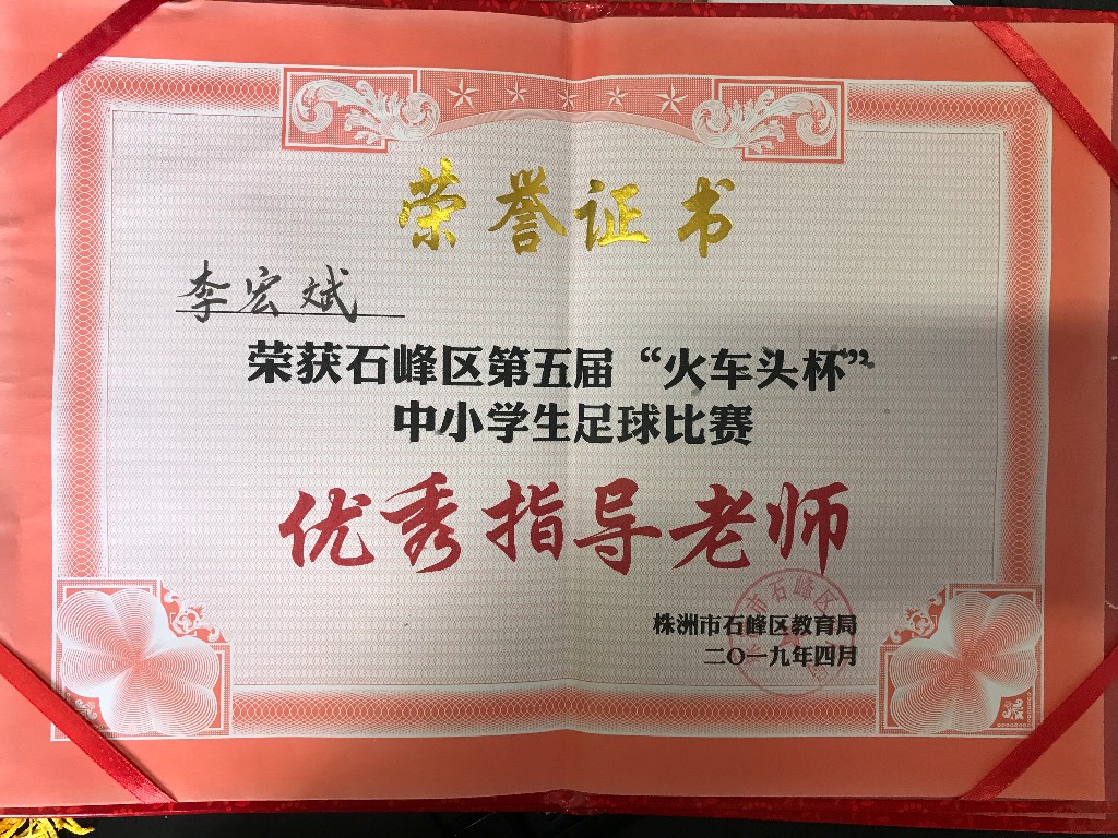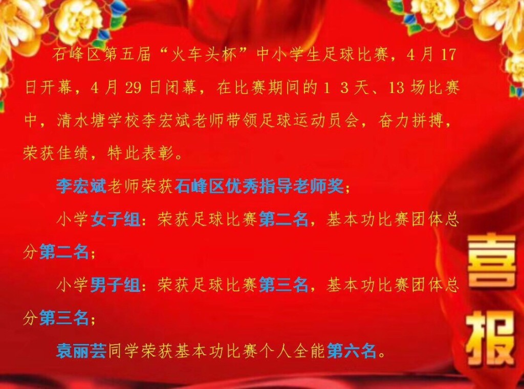 石峰区第五届“火车头杯”中小学生足球比赛,4月17日开幕,4月29日闭幕。在13天的比赛中,清水塘学校李宏斌老师带领足球运动员们,奋力拼搏,荣获佳绩。