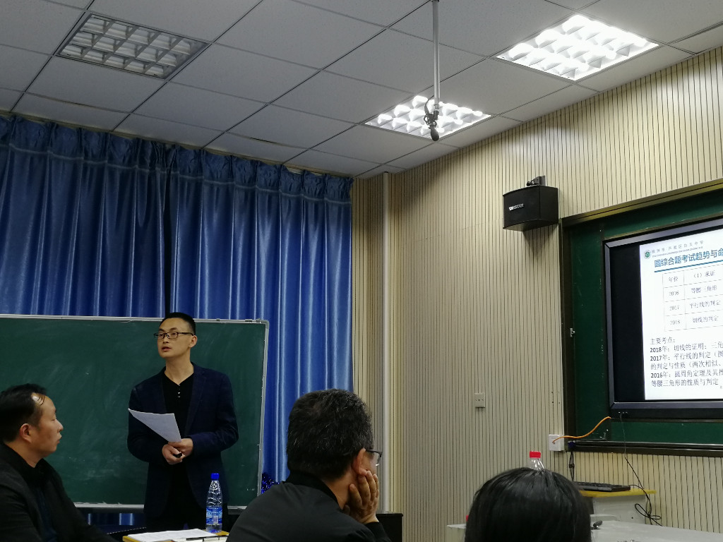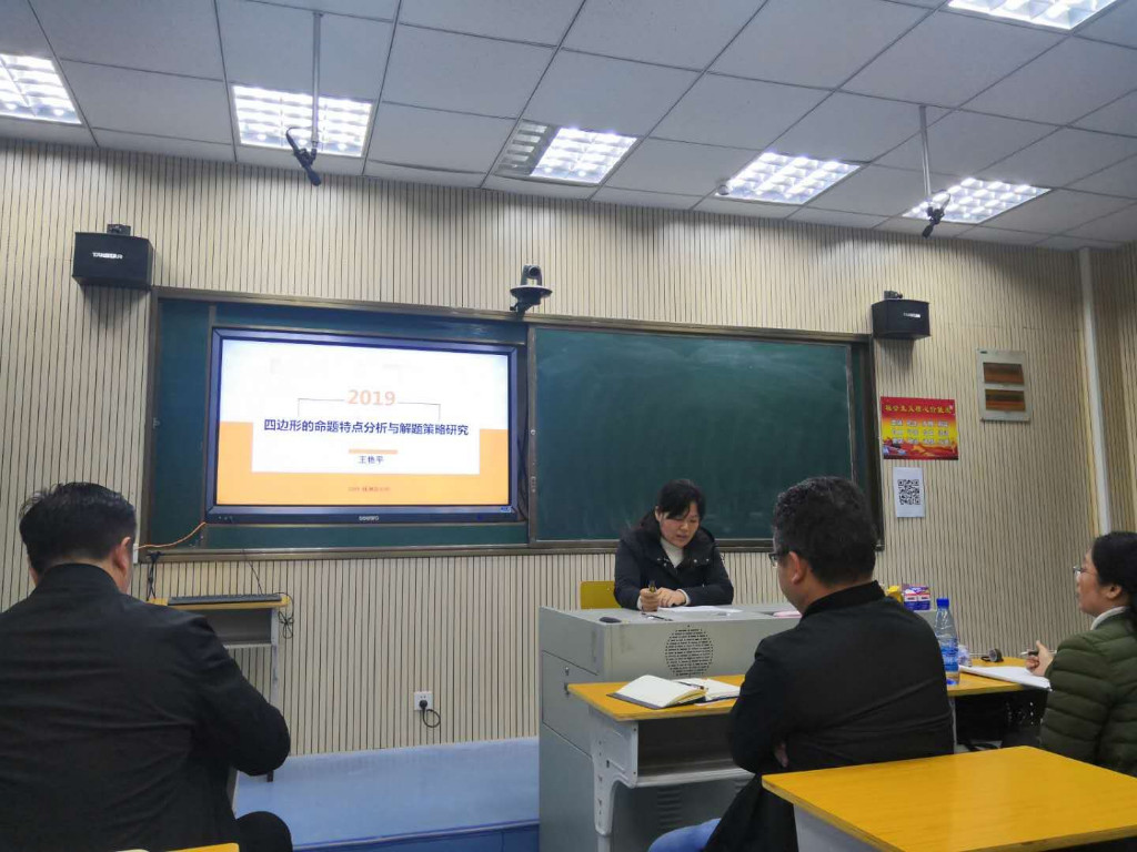 王艳平老师就近几年四边形考点进行了逐一分析,总结必考点和轮考点。牢记基本概念,变换基本图形,挖掘隐含条件。王老师从双垂图形到勾勒笔画回归教材图案绘制考题,让全体老师享受了一场“四边形”大餐。
