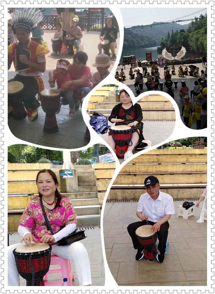 一踏入景区,就见装扮很有特色的非洲小伙和姑娘在进行非洲鼓的表演和教学,我们的老师们也按捺不住激动的心情,跃跃欲试,大胆的走出观众席,到表演场地试试身手。其余人则坐在观众席欣赏同事们的表演,聆听美妙的非洲鼓演奏的音乐。