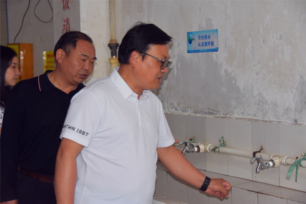 省水利厅水资源处调研员潘永红在我校食堂现场查看节水龙头。