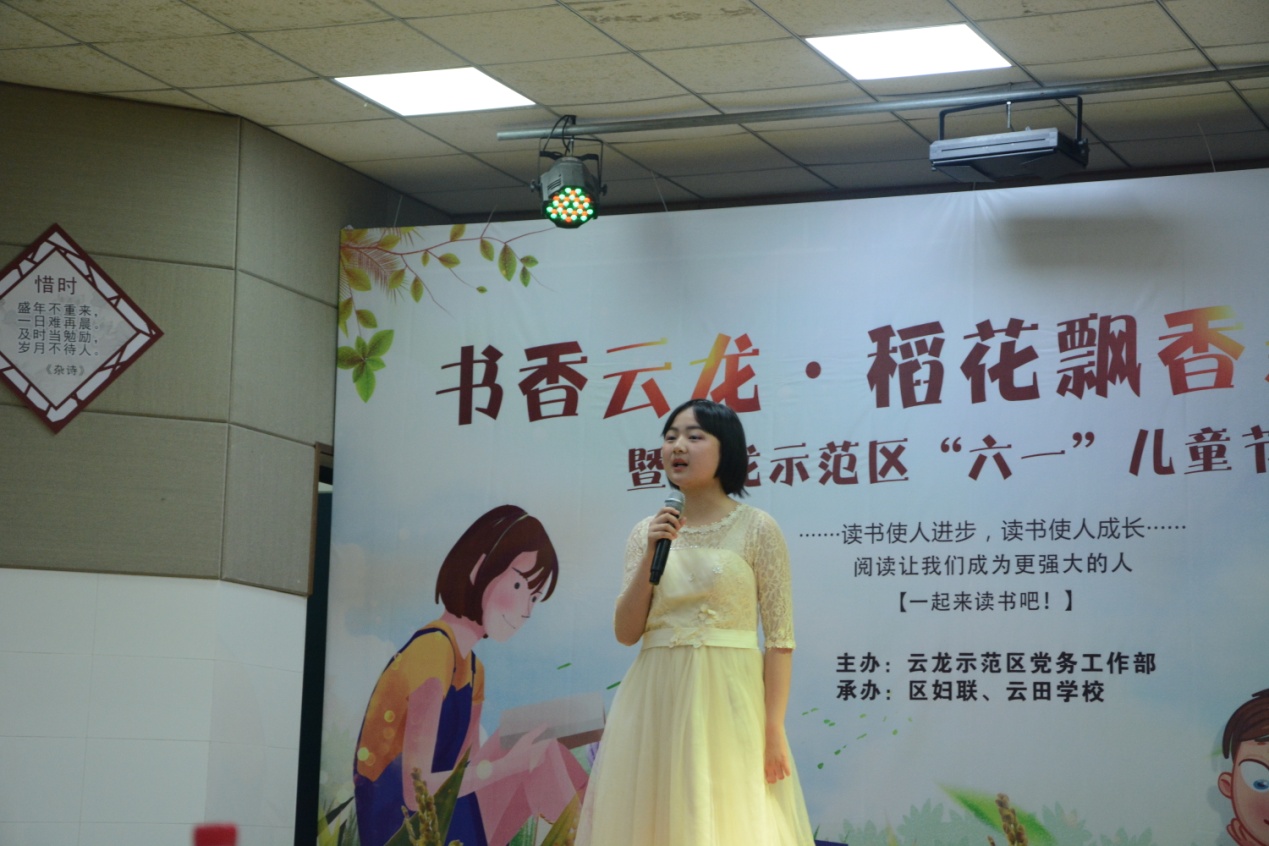 活动开始时少先队员首先为现场嘉宾佩戴红领巾,"谢谢你,你叫什么名字?"佩戴过程中蔡书记微笑地询问自己面前的小朋友。致辞中蔡书记表达了对同学节日的问候及祝福,希望同学们通过遨游书海,树立远大理想,培养高尚情操。蔡书记还说:"腹有诗书气自华,最是书香能致远。少年儿童要珍惜时光,好好学习,天天向上,争取做好时代的美德少年、有志少年。家长、老师要做好榜样,言传身教,让阅读陪伴孩子健康成长,希望有关单位以此为契机,深入开展全民阅读活动,推动云龙更高水平文明层次建设。"随后蔡书记授予云田学校为"稻花香"亲子共读活动中心,授予杨可馨等3个家庭为"书香家庭"。接着由市妇联谢逢娥调研员带领50组家庭进行"稻花香" 亲子共读,诵读篇目为《岳阳楼记》,谢逢娥女士抑扬顿挫、极富节奏感的范读使得现场掌声雷动,云田学校学生朗诵的《春来无处不花香》、《在山的那一边》、《你是人间四月天》精彩纷呈。
