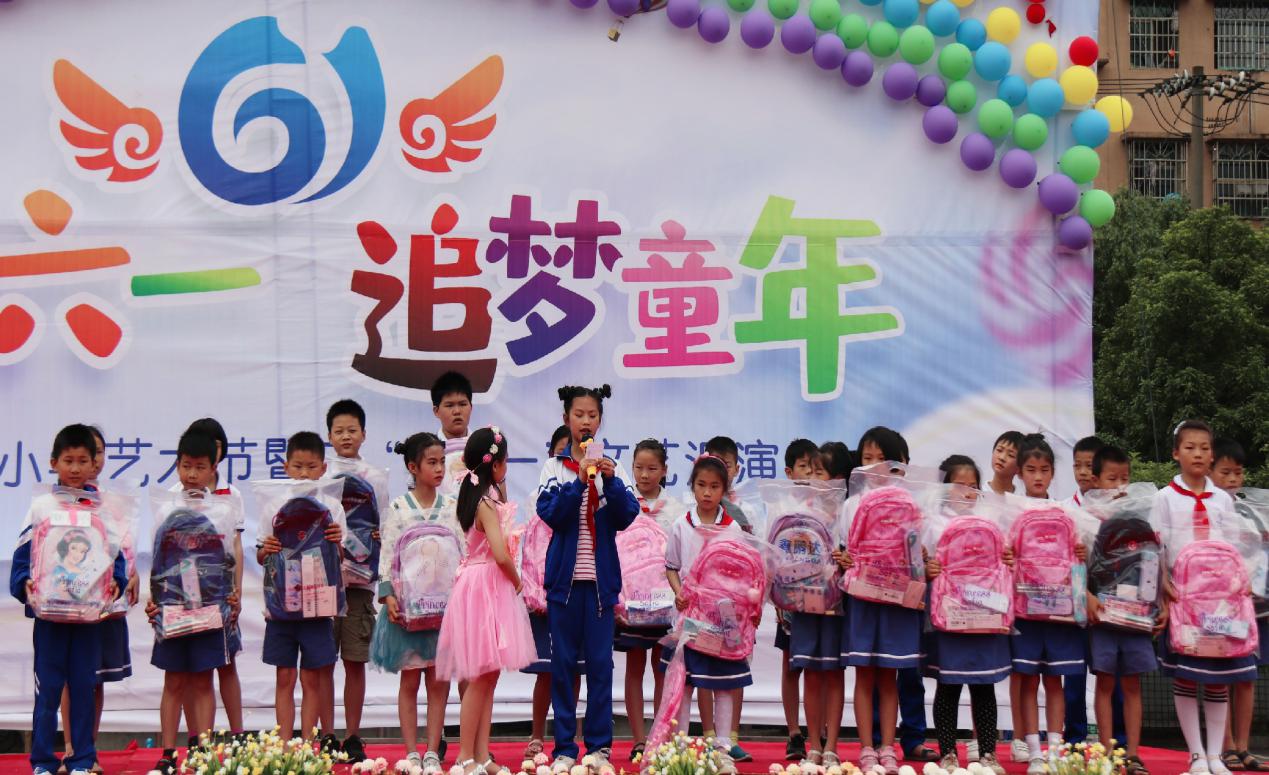 在六一文艺汇演中,有这样一个感人的环节:明德小学校领导给每位建档立卡学生送上六一儿童节的礼物。