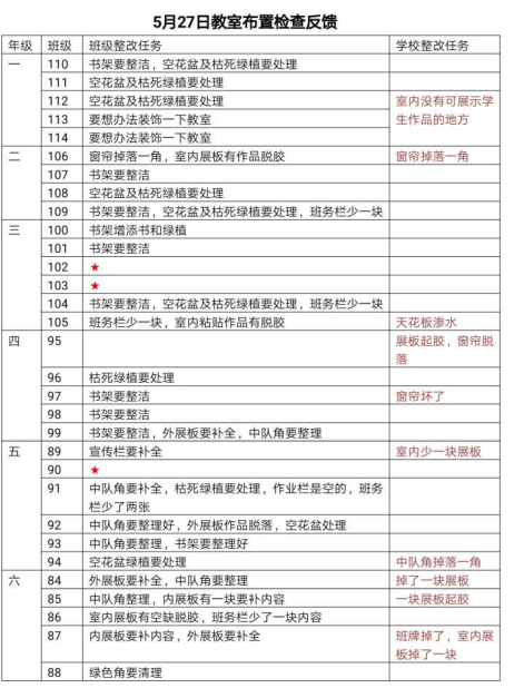 在检查中发现,部分班级的宣传栏张贴的内容没有及时更新,比较陈旧,宣传栏内容缺失;中队角、班宣栏张贴不规范;图书角书本摆放不整齐。督导处将各班存在的问题一一记录,并发出限期整改通告,要求各班在5月28日下班前将问题整改到位。