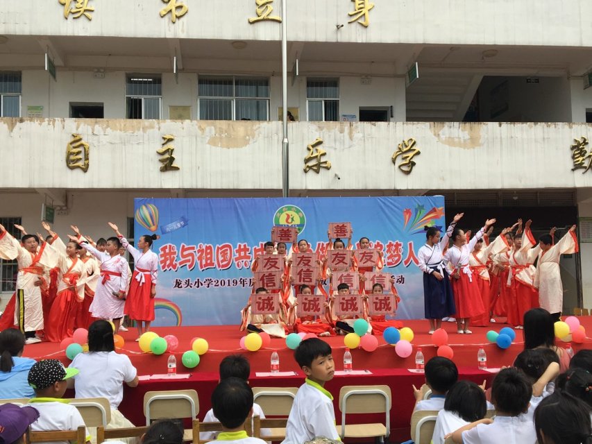 5月29号,龙头小学隆重举办了"我与祖国共成长·争做小小追梦人为主题的"庆六一暨家长开放日、社团展示活动文艺汇演活动。 上午家长们走进了课堂,和孩子们共上同一节课;然后,在食堂和孩子们共进中餐,并就食堂问题提出宝贵的意见。下午的演出在《我们的阳光体育活动》的舞蹈中拉开了帷幕。各班的节目真是百花齐放,各有千秋。有舞蹈《一年级》、《宝贝宝贝》、《逆战》等;经典朗诵社团的节目《春晓》;此外还有故事表演、乐器演奏等。最让人深刻的是节目最后师生合唱《我和我的祖国》,"我和我的祖国,一刻也不能分割......"这是我们对祖国最深情的告白。