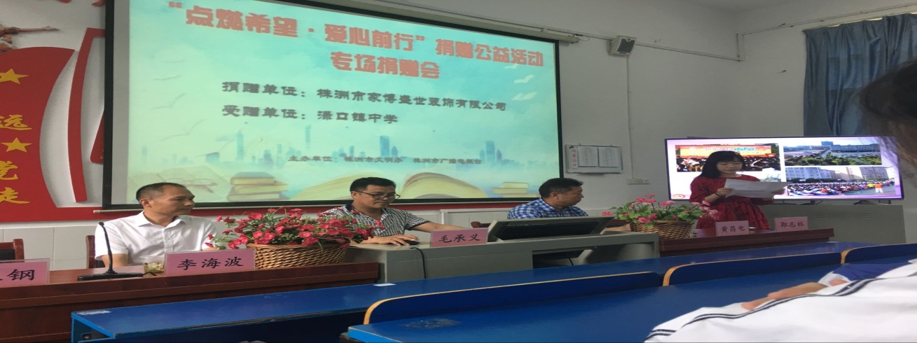 上午十时许,家博大家装董事长李海波协同株洲市装饰办黄昌电主任、株洲市电视台张智等一行来到渌口镇中学。在渌口镇中学多媒体教室举行了隆重的"点燃希望、爱心同行"的图书捐赠仪式。
