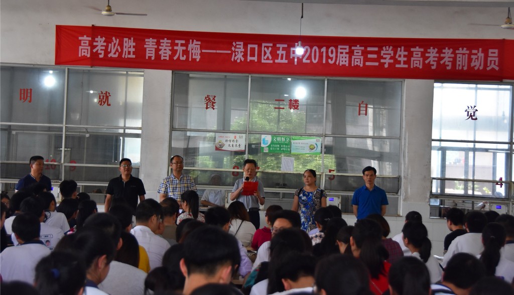 海阔凭鱼跃,天高任鸟飞。6月的五中,花果山的雏鹰即将振翅高飞;6月的五中,高三的学子即将征战考场。为给高三学子壮行加油,6月4日中午,株洲市渌口区第五中学在学校食堂为2019届高三学生举办壮行宴。全体高三学生和学校党政领导及高三年级全体任课教师欢聚一堂,言壮志、话宏图。活动由副校长周建主持。