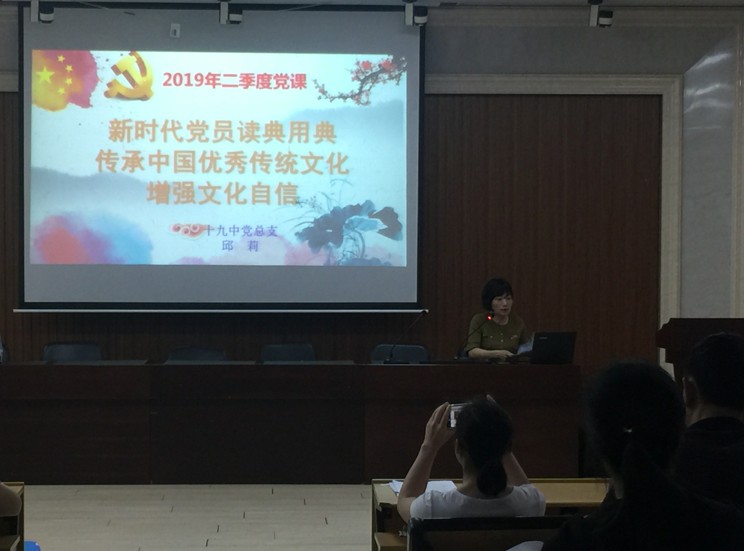 接着党总支邱莉书记为全体党员上了第二季度的党课。她从最新出炉的2019年高考政治、化学等试卷切入,谈新时代党员如何读典用典,如何传承中国优秀传统文化,如何增强文化自信,并勉力我们的党员教师们要做真正有文化的教育,让学生在祖国优秀传统文化的熏陶下茁壮成长。