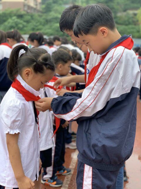 一年级100名同学经过一年的努力,终于在"六一"前夕加入到了中国少年先锋队这个光荣的大组织里,六年级100班、102班的大哥哥大姐姐们为新入队的学弟学妹们系上了鲜艳的红领巾。