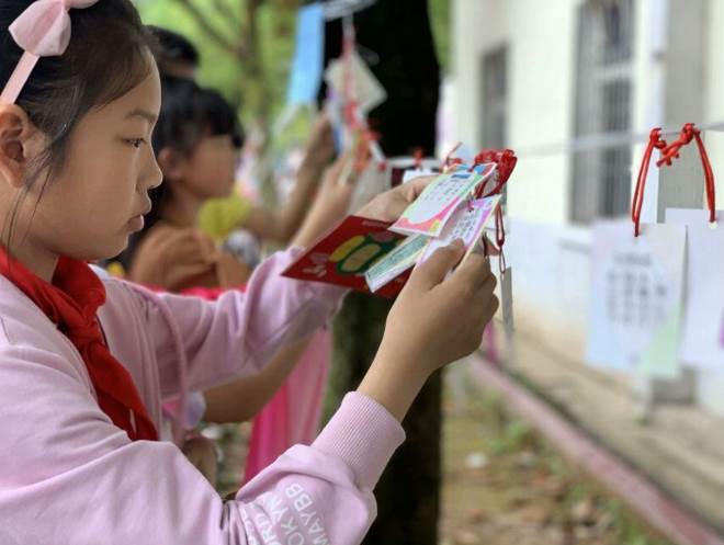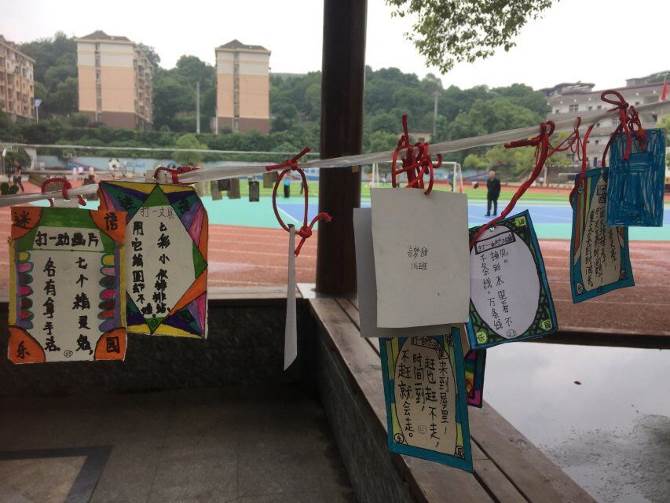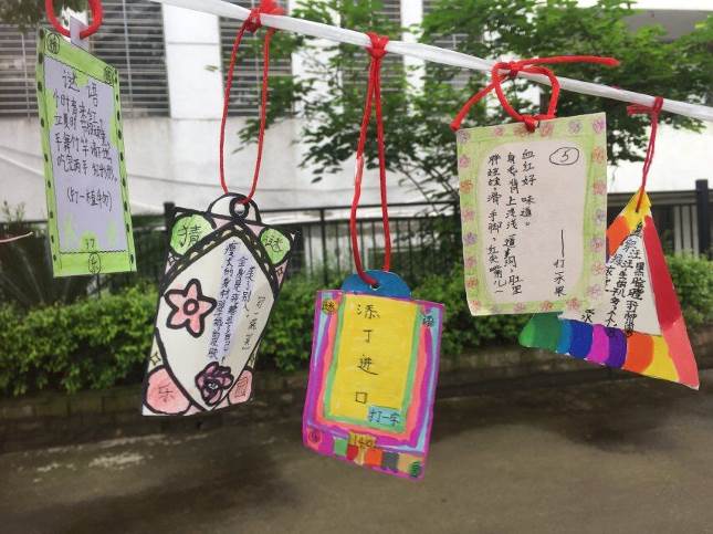 猜谜语:现场悬挂的所有谜语都是四年级同学自己设计、自己制作的,猜谜是一种挑战,欣赏孩子们写在书签上的谜面更是一种享受。