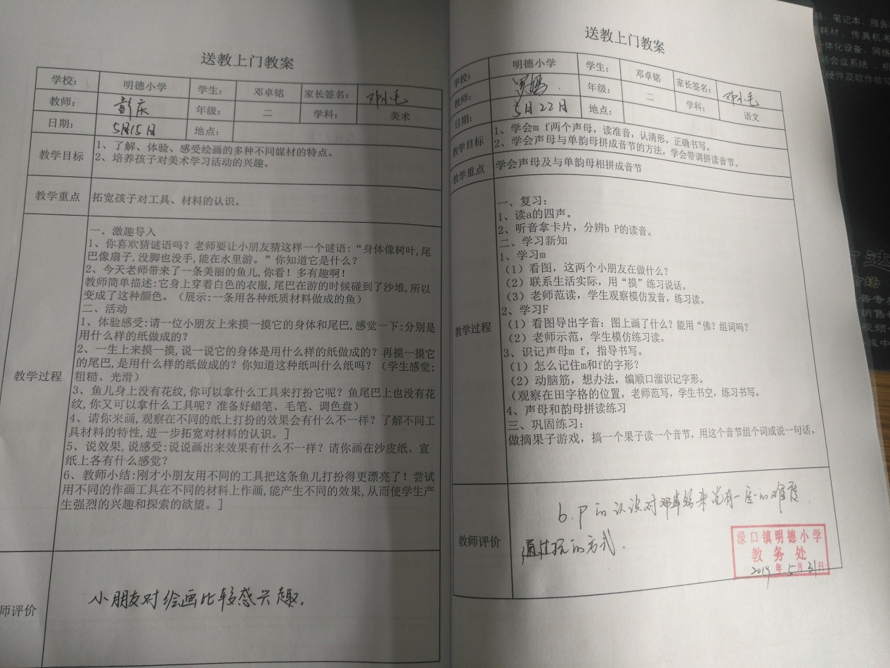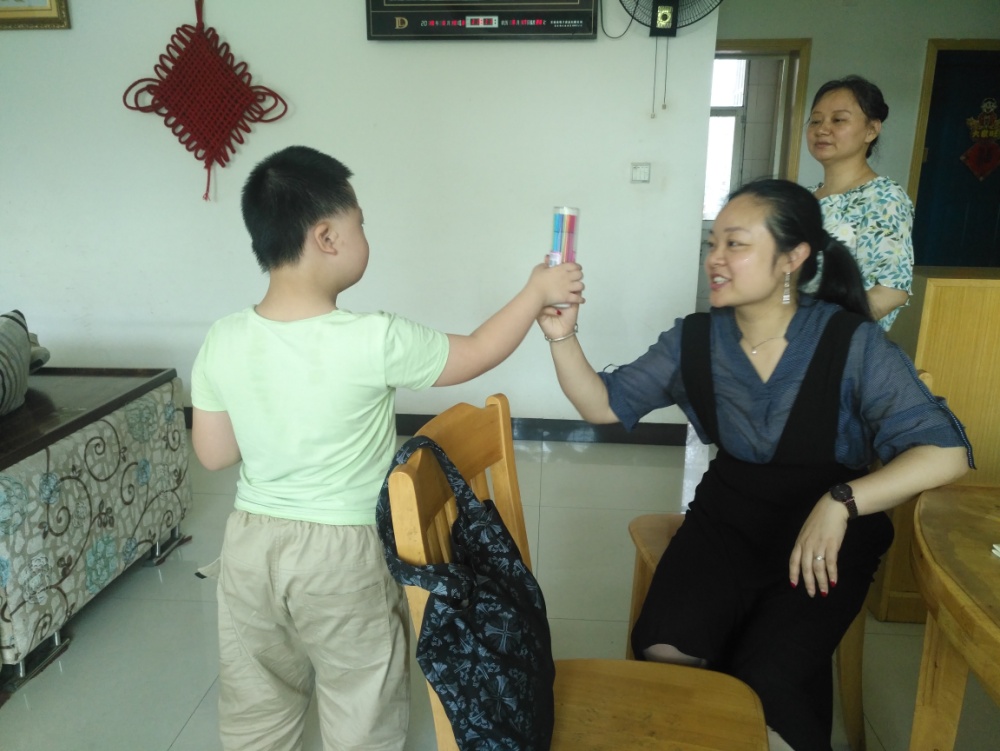 教育的百花园中,百花吐艳离不开园丁爱的奉献;在金秋的硕果园里,硕果累累离不开耕耘者心的浇灌;送教上门的孩子们更离不开"天使老师们"的悉心呵护。为全面贯彻落实教育扶贫政策,确保重度特殊儿童不因身体残疾而辍学、失学。2017年9月开始,明德小学将送教上门活动落到实处,明德小学部分教师有组织、有计划的为辖区内的残疾儿童开展了"送教上门"服务,其中邓卓铭同学在明德小学注册学籍号,送教上门活动持续两年。