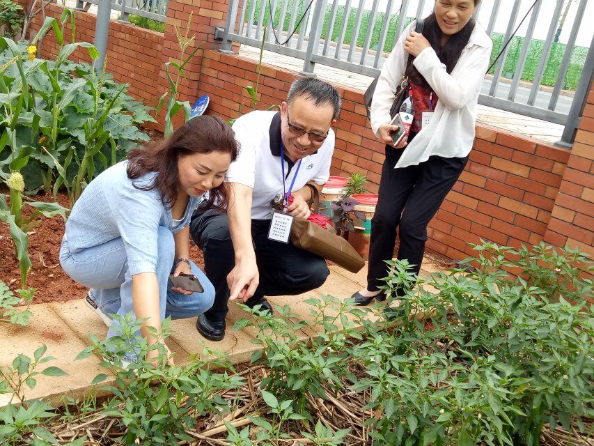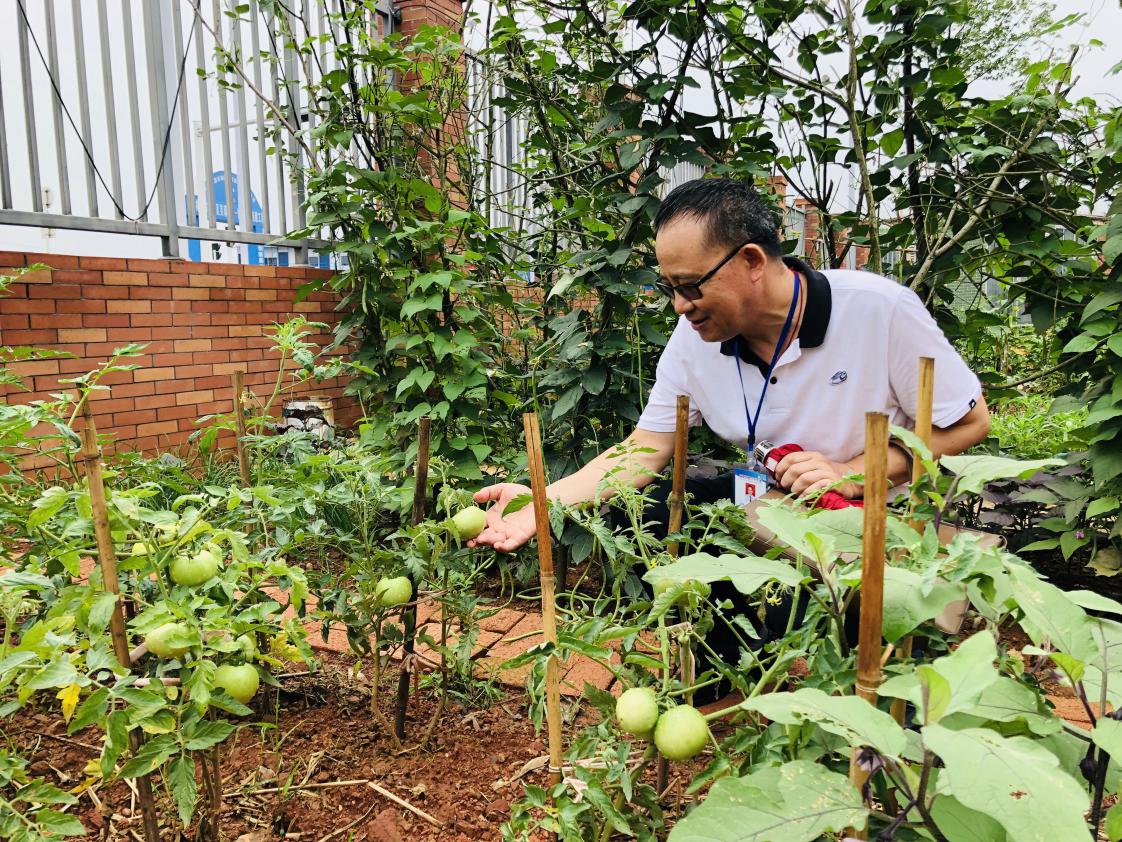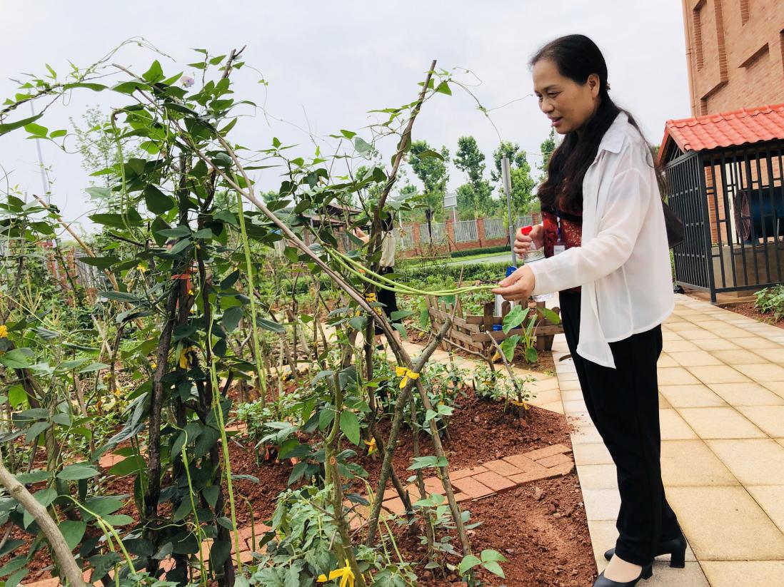 最后,两位督学来到学校种植基地,饶有兴趣地视察了全校16个班级的蔬菜种植情况。当看到一串串又尖又长的辣椒、一个个又大又圆的西红柿、一根根又细又嫩的豆角时,两位督学高兴地说:这是美的学校独一无二的种植特色,它既可以让学生熟知每个季节种植的蔬菜,了解蔬菜的种植过程,又可以培养学生的劳动技能,还有效地利用了学校的每一个角落,美的校园无处不惊喜。