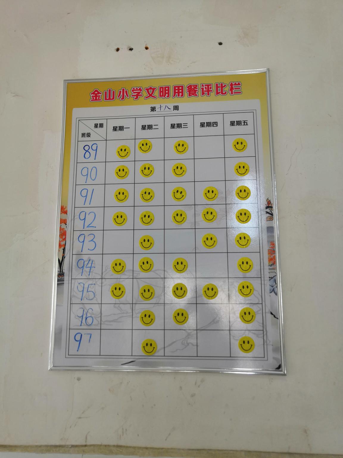 每日读报课,红领巾广播站及时反馈当天文明就餐情况,进行班级文明评比,表扬优秀班级,指出同学们就餐时存在的问题,督促各班积极改正。民以食为天,食以礼为上。金山小学通过安全就餐管理制度化、文明就餐教育多样化,加强学生安全就餐、文明就餐,杜绝此类事故发生。