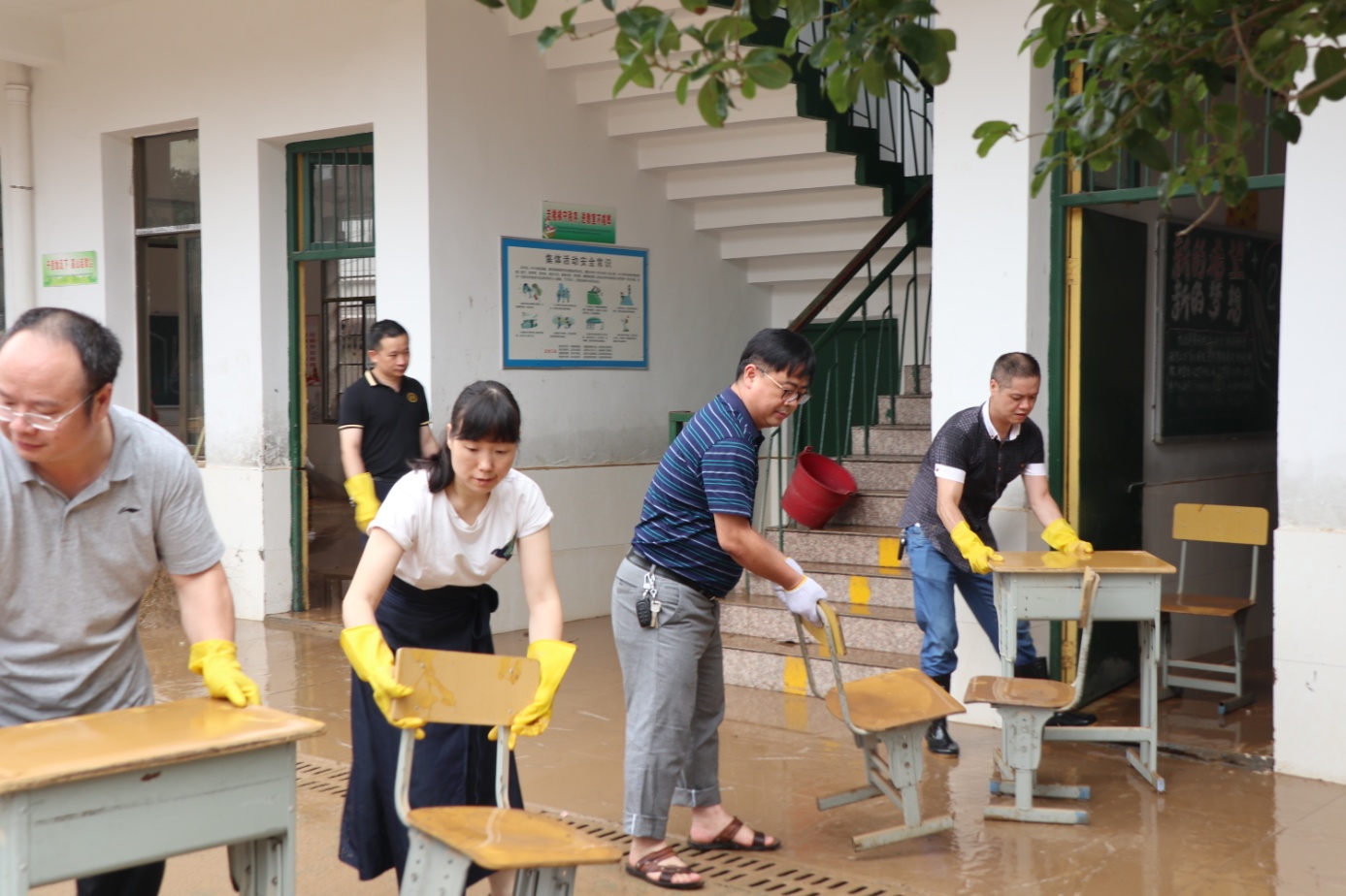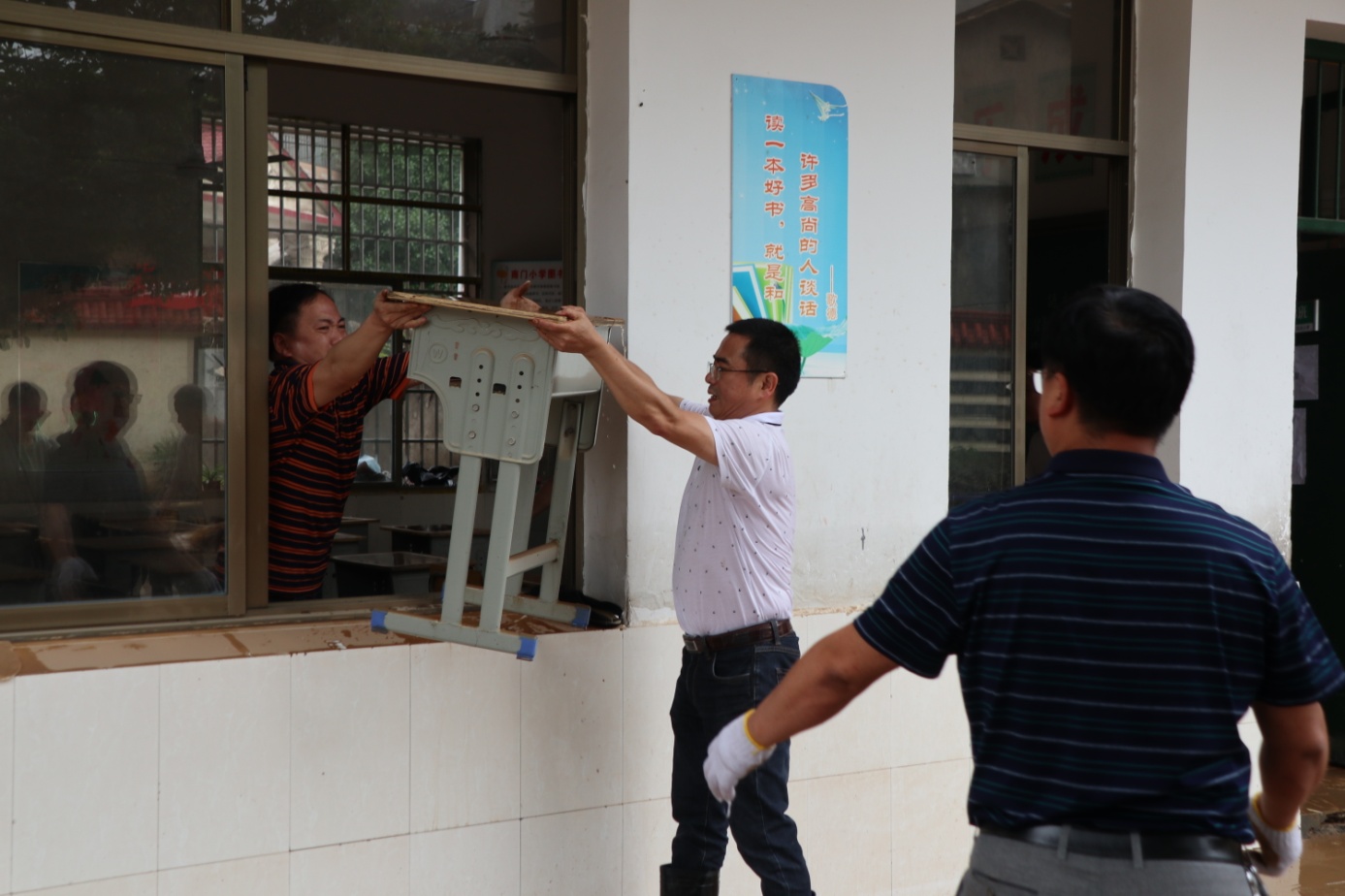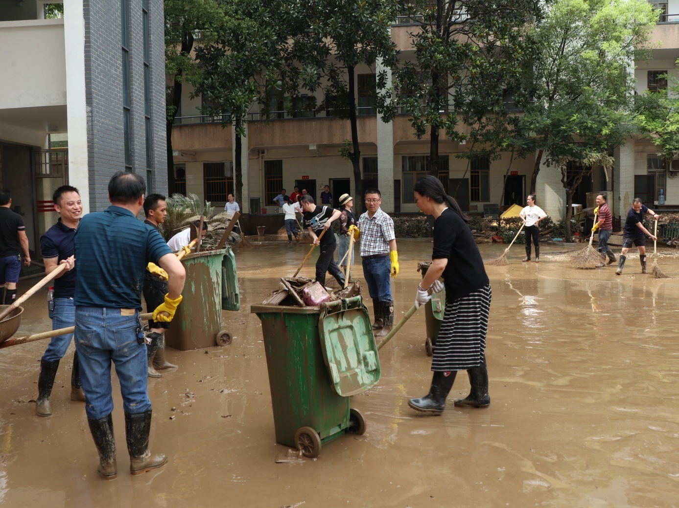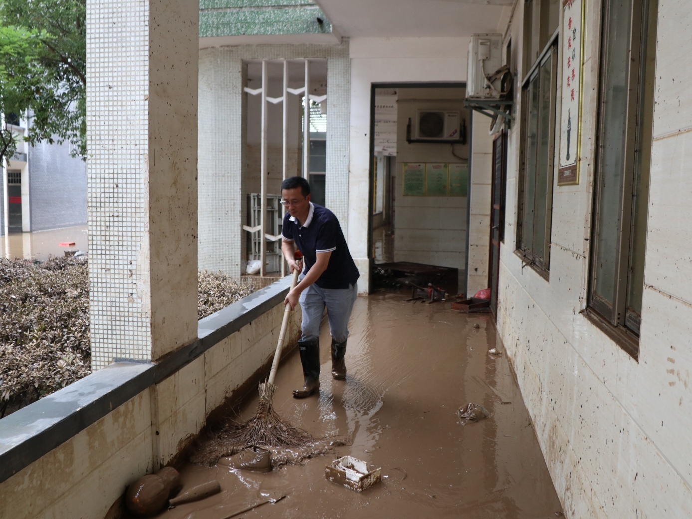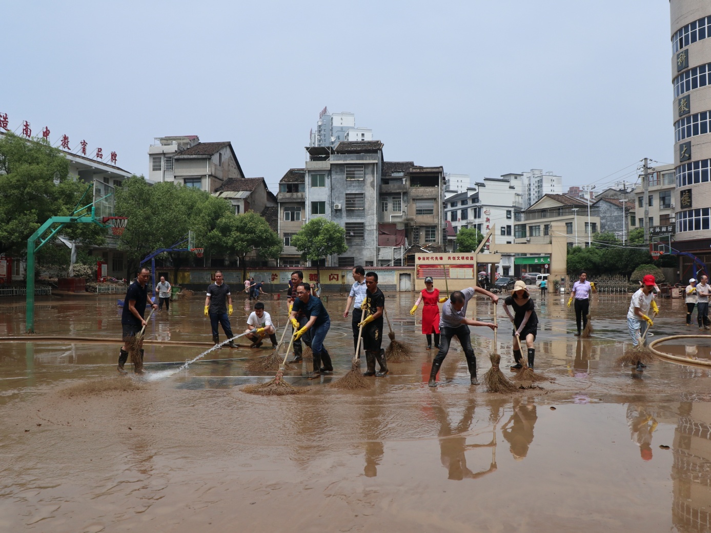 7月10日上午,洪水尚未完全退去,醴陵市教育局党委书记、局长谢世军即带领全体机关干部到属地重灾区仙岳山街道南门社区和南门小学、南门中学参加灾后清扫、消毒、整理工作。
