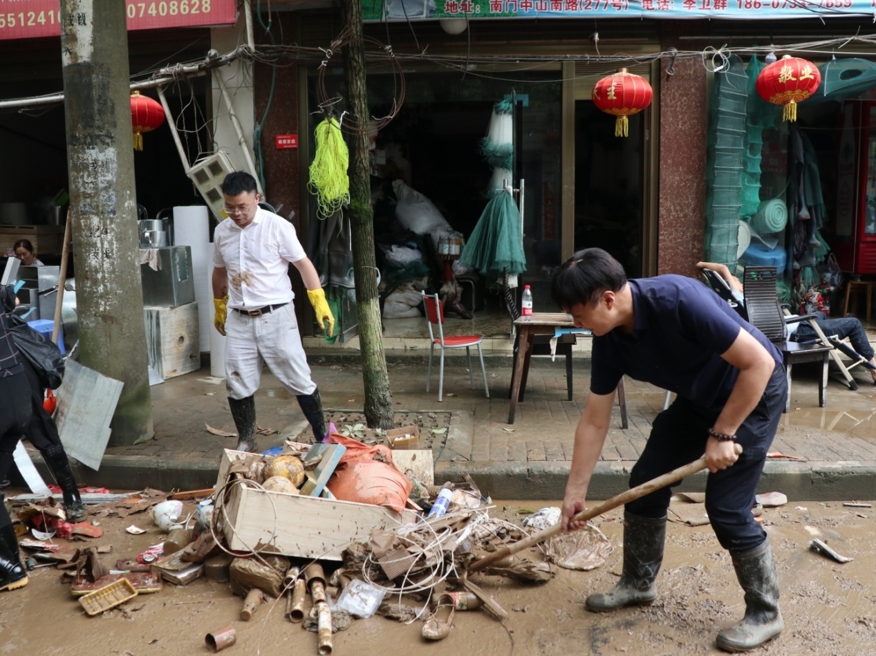 孙家湾镇观前小学党员黄辉在确保本校平安之后,带着刚刚高中毕业的儿子,转赴灾情更加严重的泗汾镇枧上村参与抗洪救灾工作。