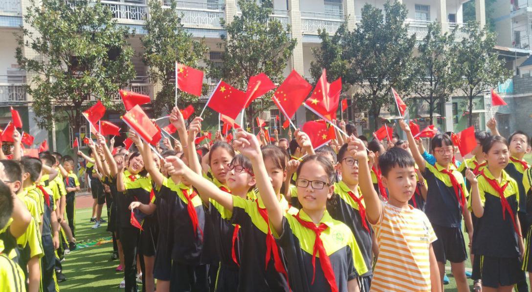 师生共持国旗,高歌《我和我的祖国》,热血沸腾,齐表学子满腔爱国心;挥举右手,庄严宣誓,饱含爱国爱校情;谆谆教导,认真聆听,校长牵引踏进学习门。