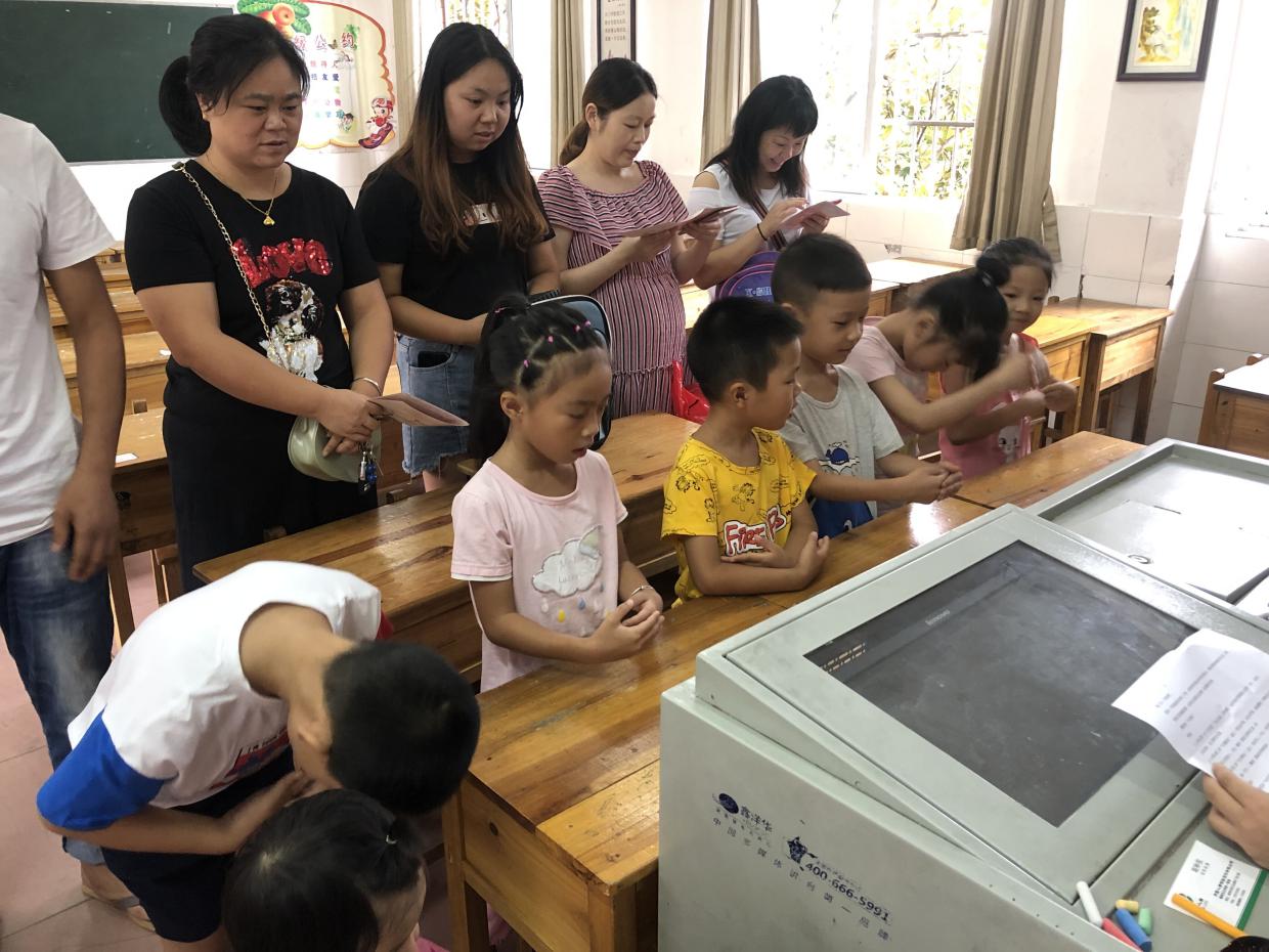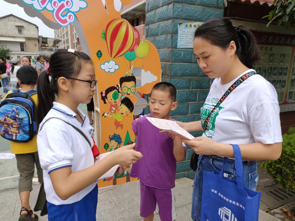 志愿者们分发了一张"一年级入学通关卡",引导他们闯过第一关:"启智门",要求小宝贝们与爸爸妈妈牵手走过"启智门",寓意开启智慧之门,踏上求知之路。