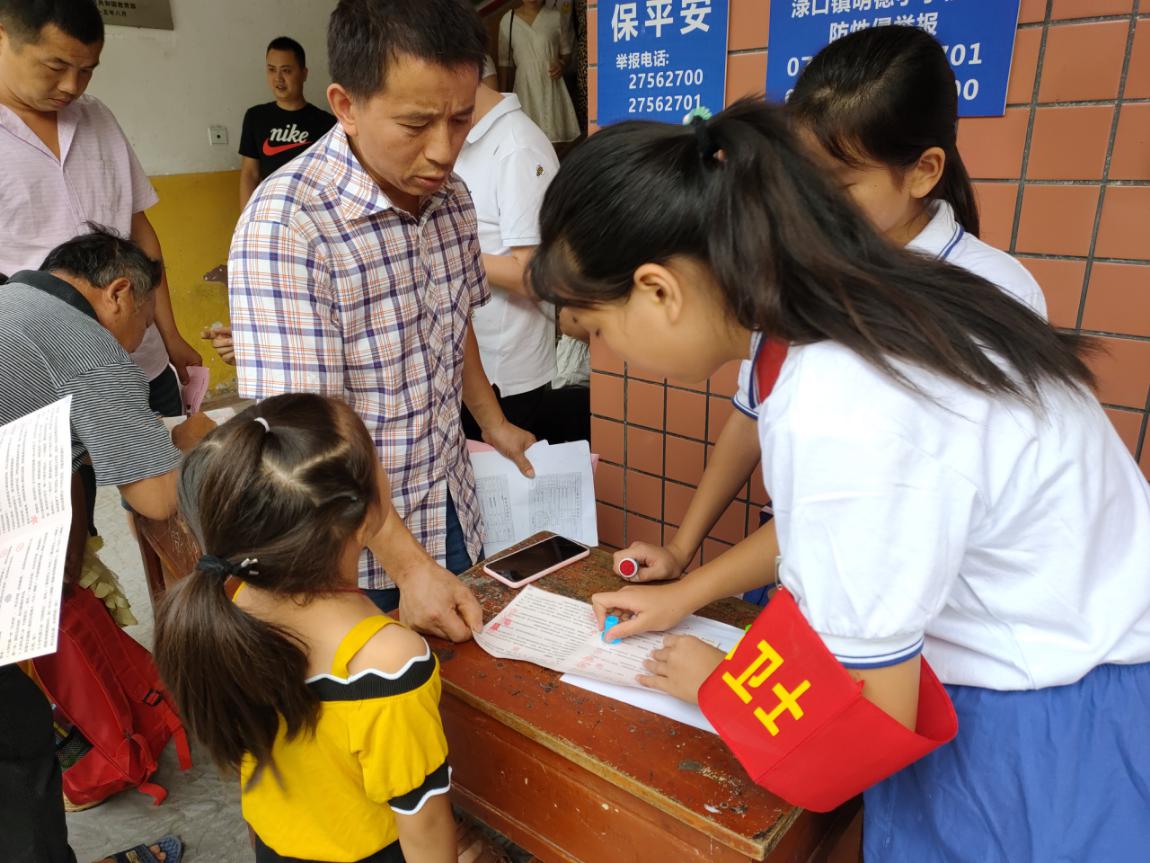 崭新的校园里,有一群穿着校服,左臂戴着红色袖章的"红领巾志愿者"们,他们早已等候在校门口,以饱满的姿态,热情的服务迎接家长的询问,告知他们入学须知。