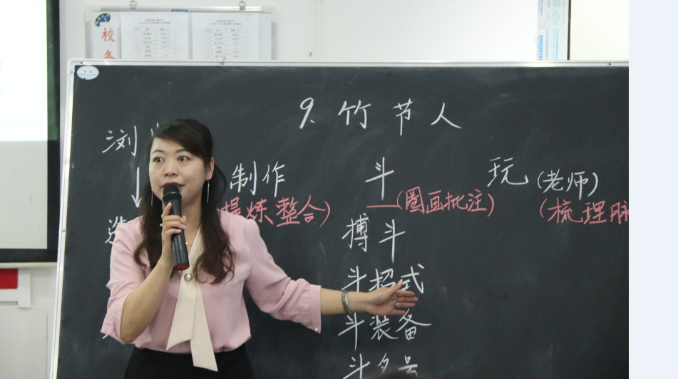 活动的第一个环节,由谭晶老师执教六年级上册第三单元即阅读策略单元第一篇课文《竹节人》。第一课时,谭老师先引领学生品悟单元导语"读书,好比隐形的串门儿"句中含义,在轻松愉悦的氛围中,打开了学生的话匣,巧妙地引入了课题。初读课文,了解主要内容后,再引导学生关注课前导读部分,使学生明确学习本篇课文的三个阅读任务,提出"有目的地阅读"这一阅读策略 。接着,选择"斗竹节人"这一阅读任务,引导学生运用圈画批注的方法进行细读,品味出"博斗、斗招式、斗装备、斗名号"之乐。第二课时,则让学生以小组为单位自主选择,完成另外两个阅读任务,借助了学习单这一工具落实"提炼整合、梳理脉络"的具体学法。最后又通过"阅读链接"对本课所学的阅读策略进行再次巩固。"阅读策略单元",对于老师们来说是一种全新的教学内容。谭晶老师用温婉知性的课堂,为与会老师指明了阅读策略教学的方向,如醍醐灌顶,使大家收获满满。