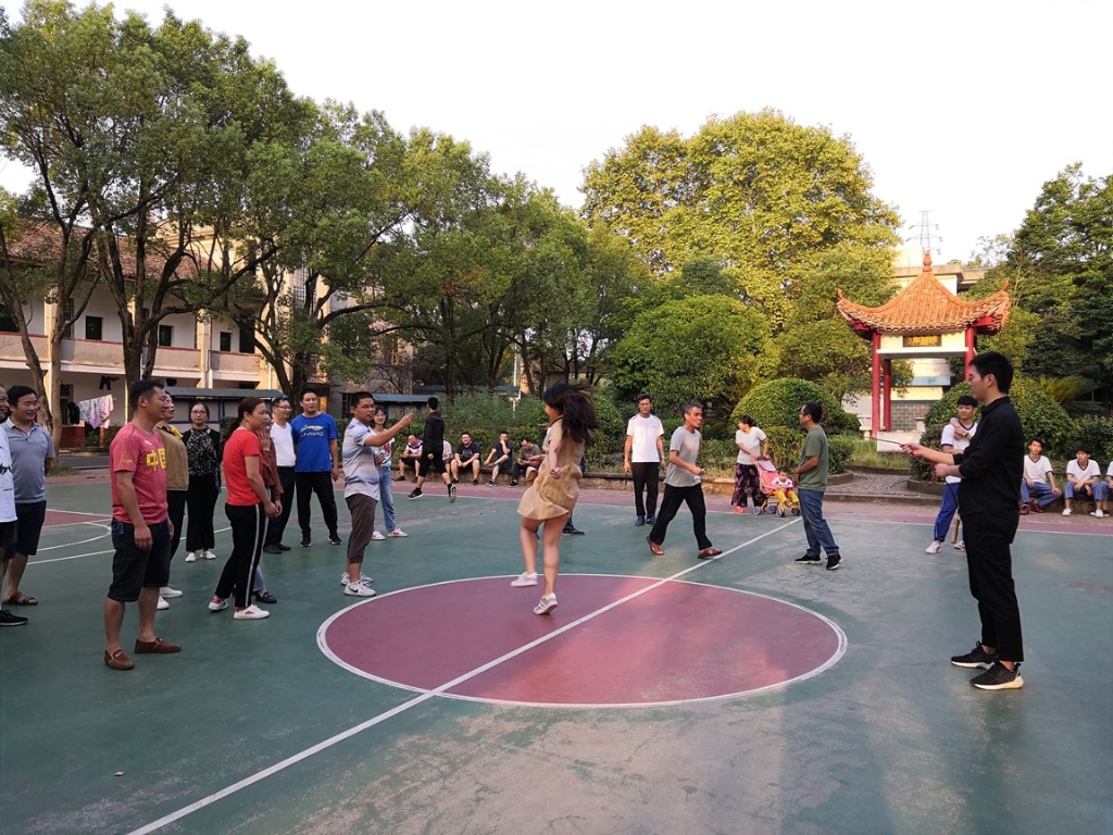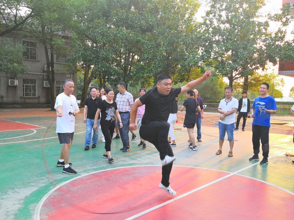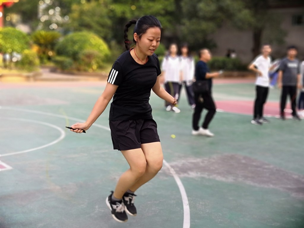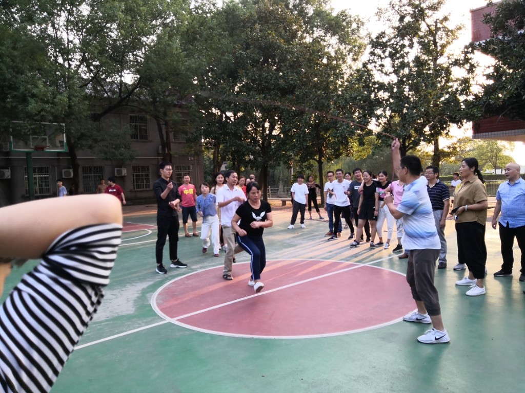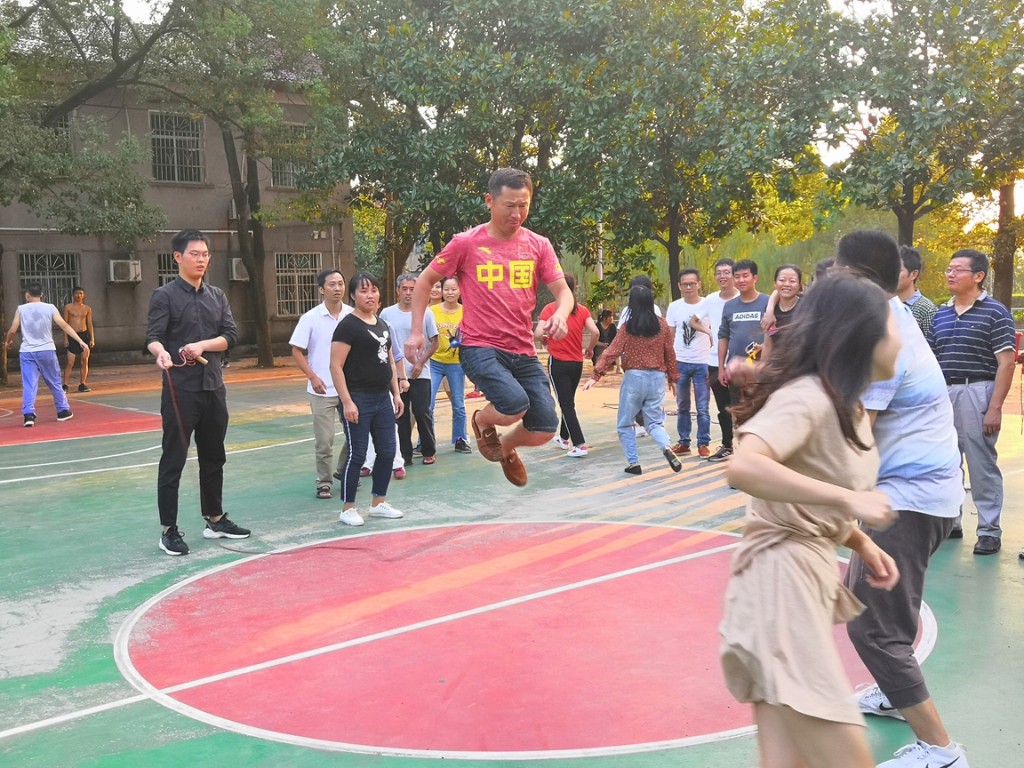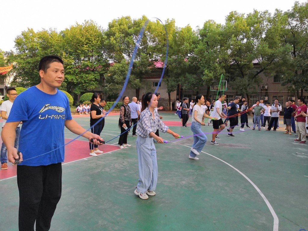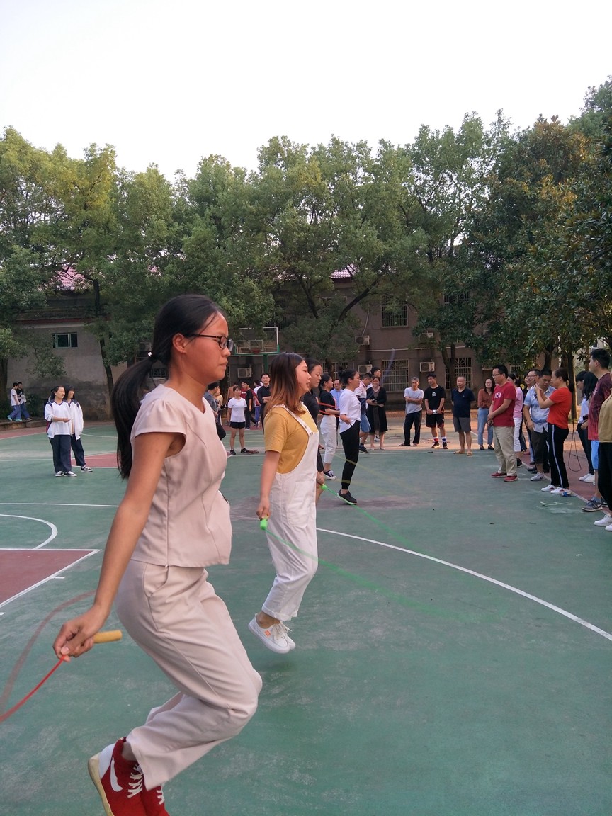 9月19日下午课后,操场上笑声一片,场面火爆:这里正在举行教职工跳绳比赛。