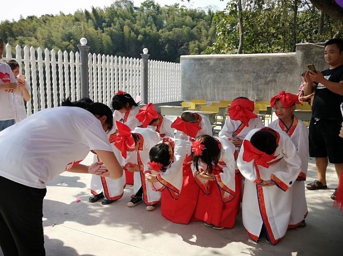 向启蒙老师行谢礼(感谢老师的教育之恩)、向后转对父母行谢礼 (感谢父母的养育之恩)