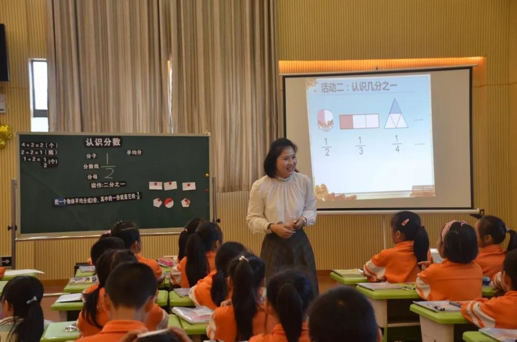 第四节课是由白鹤小学王格老师执教的《认识分数》,格格老师整节课利用吸引学生的小动画,让课堂氛围达到高潮,让学生在动画中认识分数,印象深刻,记忆犹新。学生主动地去认识分数,认识其读写和组成,题目难度层层递进,让学生对分数的理解越来越明晰。