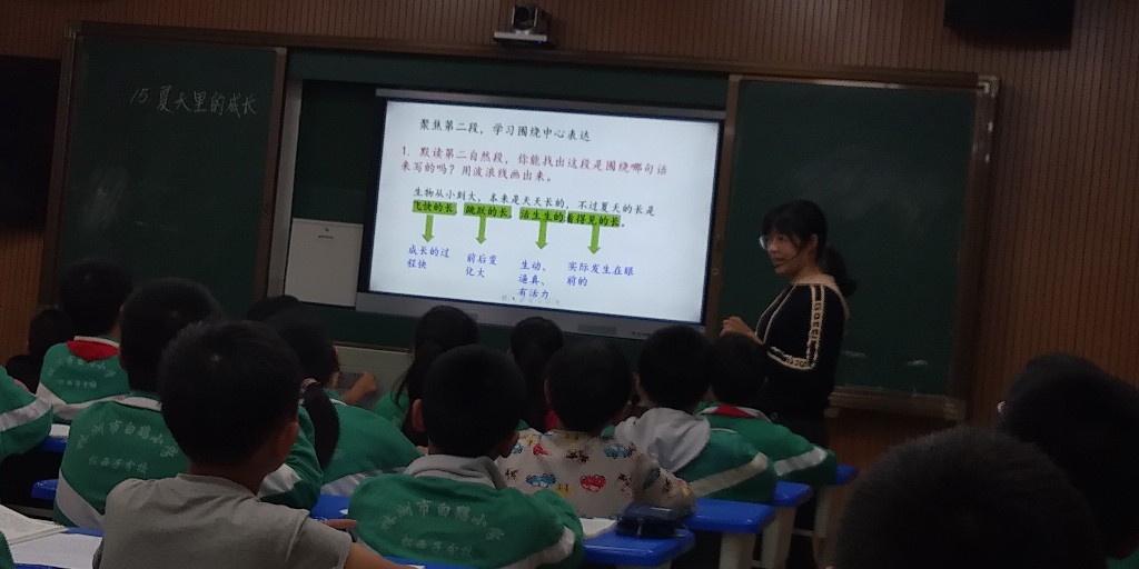今天语文教研共同体活动的第二堂课是由明德小学张咪老师执教的《夏天里的成长》。她首先从中心句“夏天是万物长大的时期”入手,体会植物动物乃至万物的长。然后重点研读第二自然段,抓住“生物从小到大,本来是天天长的,不过夏天的长是飞快的长,跳跃的长,活生生的看得见的长。”这句话,反复诵读,引导学生理解文章是围绕生物在夏天生长速度特别快这个中心意思来写的。然后让学生欣赏夏天里生物生长的图片,进一步直观感受夏日里那活生生看得见的长。从而指导有感情地朗读这一段,最后引导学生体会作者为什么能把这一段写得这么形象呢?让学生明白就是因为选取了具有代表性的事物,并抓住事物的特点进行描写,给人留下了深刻的印象,帮助学生建立写作文时也要抓住有代表性的事物的特点去写的概念。