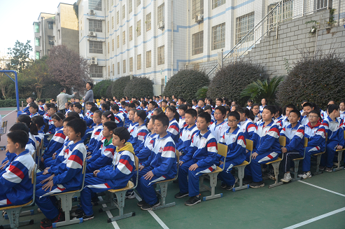 为了活跃校园生活,进一步贯彻落实“健康第一” 的指导思想,鼓励学生积极参加体育锻炼,增强体质,促进学生的健康成长。培养学生良好的合作精神和体育道德,促进学校各项管理规范、有序发展,11月15日下午株洲第十九中学举行在篮球场举行初一年级广播操、跑操比赛。下午三点半,七年级全体学生穿着统一校服,精神饱满地集合在洒满秋日阳光的操场上。同学们先是在等候区安静地等候,随后按照比赛顺序,学生分班级有序进入赛场。过斌校长和评委老师们于评委席认真观看本次比赛。