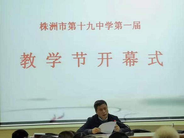 2019年12月2日,株洲市第十九中学第一届教学节正式启动。下午三点半,学校东西两校区同时隆重举行开幕式,两校区的会堂,布置一新,气氛热烈,全校教职员工参加这次盛会,过斌校长与邱莉书记分别在两校主持了开幕仪式。