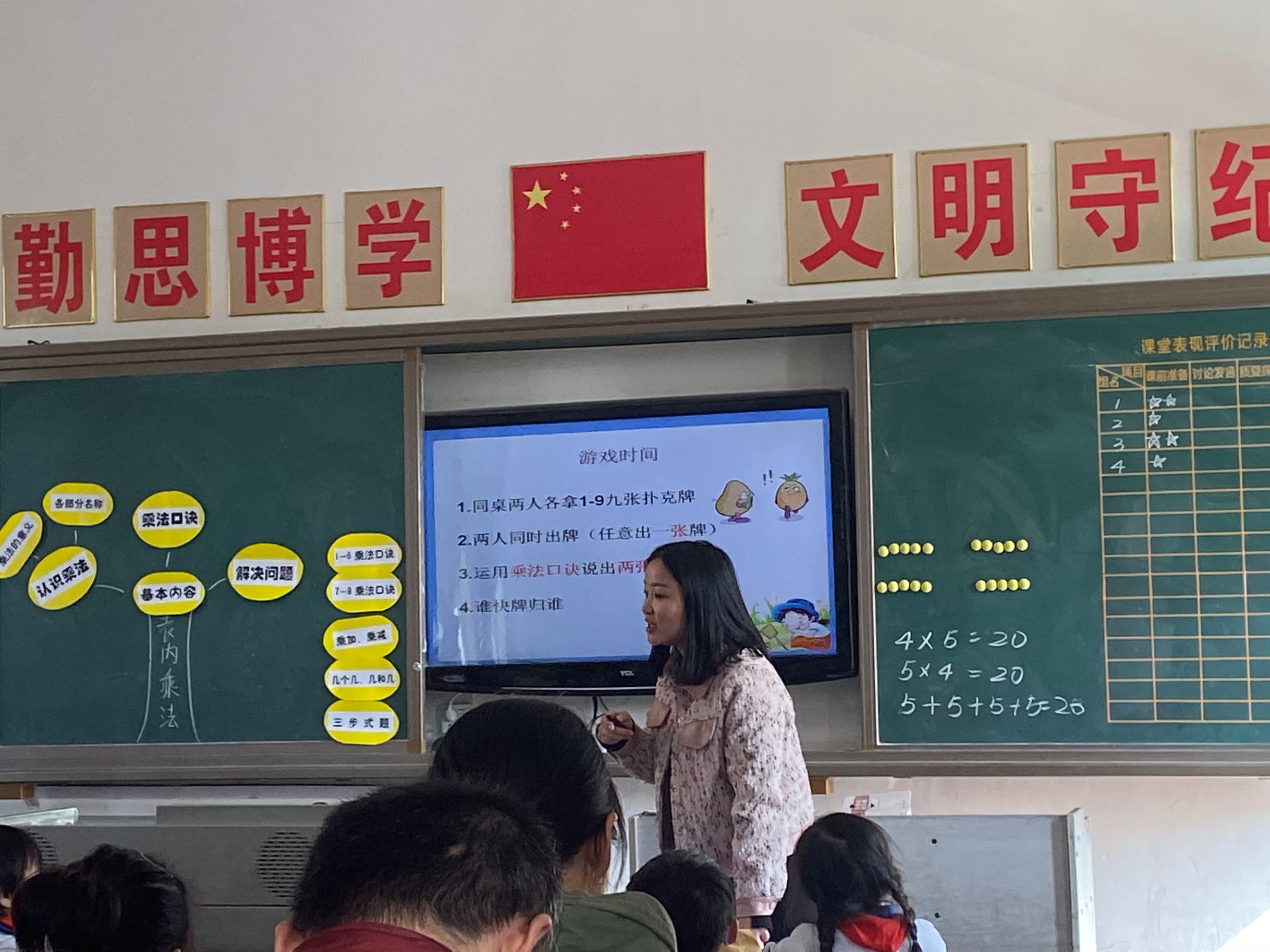 本次活动以低年级和高年级的课堂案例为载体,在两节优质的展示课中拉开帷幕。第一节课是由明德小学的高游老师带来的《表内乘法的复习》,高老师在课堂上展示了她扎实的教学基本功,体现了鲜明的教学个性。她能充分的尊重学生的心理发展规律,采用趣味十足的知识网络树形式,将整个单元的知识点借用习题的讲解串起来,使知识树不断枝繁叶茂,在学生脑海中形成了直观而又完整的知识网络结构,为学生今后的学习奠定了坚实的基础。同时,她在教学过程中插入游戏的教学环节,让学生在两张扑克牌的对弈中复习表内乘法,真正实现寓教于乐,让学生在轻松愉快的氛围中复习数学知识,充分的调动了学生的学习积极性,也将整节课的课堂气氛推向了高潮。
