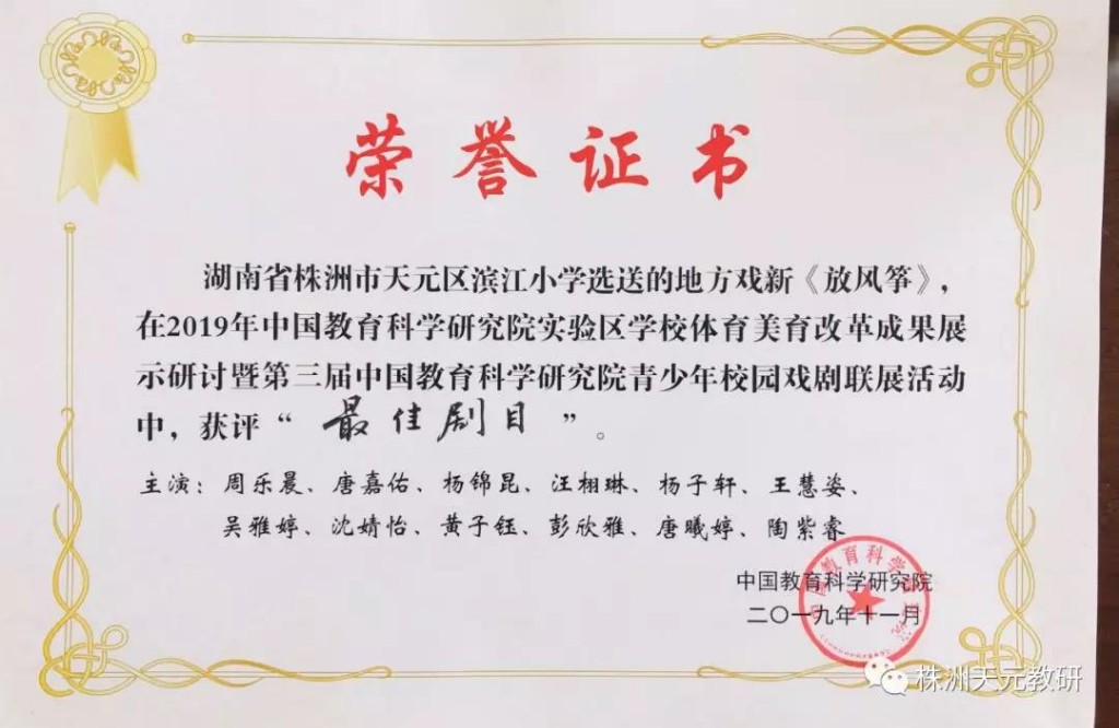 6.滨江小学《新放风筝》在“2019中国教育科学研究院学校美育改革成果展示研讨暨第三届中国教育科学研究院青少年校园戏剧联展”活动获得最佳剧目奖。