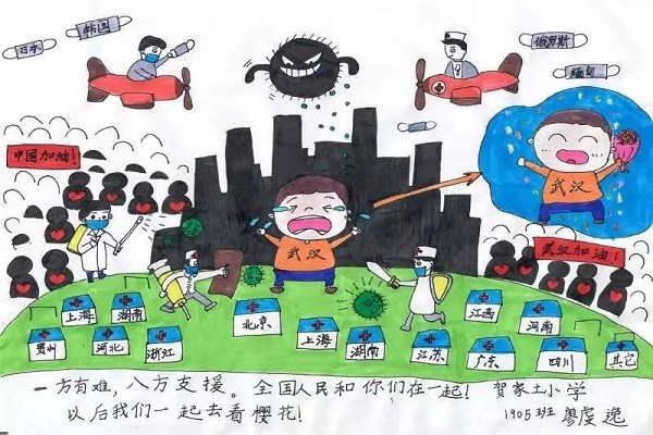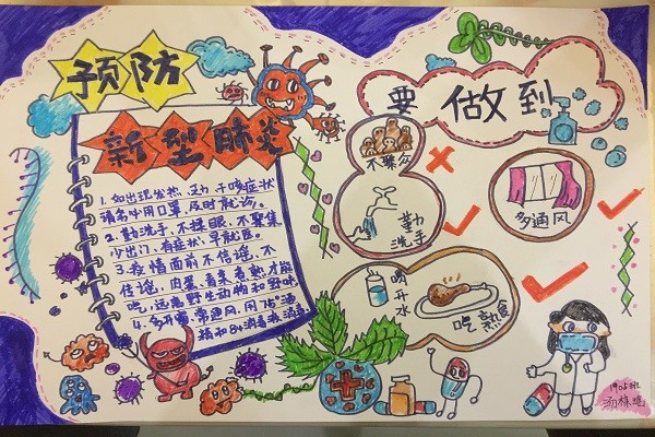 “动”则是大家积极行动起来,主动担任疫情防控宣传员。同学们在老师和家长的指导下,以笔做“枪”,创作了形式多样的抗击疫情主题作品。各年级密切结合所学,绘制了手抄报,从内容中可见“勤洗手、多通风、戴口罩”等疫情防控知识已经深入大家的心中。即便是识字量不大的一年级小朋友也“动”起来了,他们用绘画的方式表现了对抗病毒的正确方法,更用生动的画面表达了“武汉加油!中国加油!”的情感。