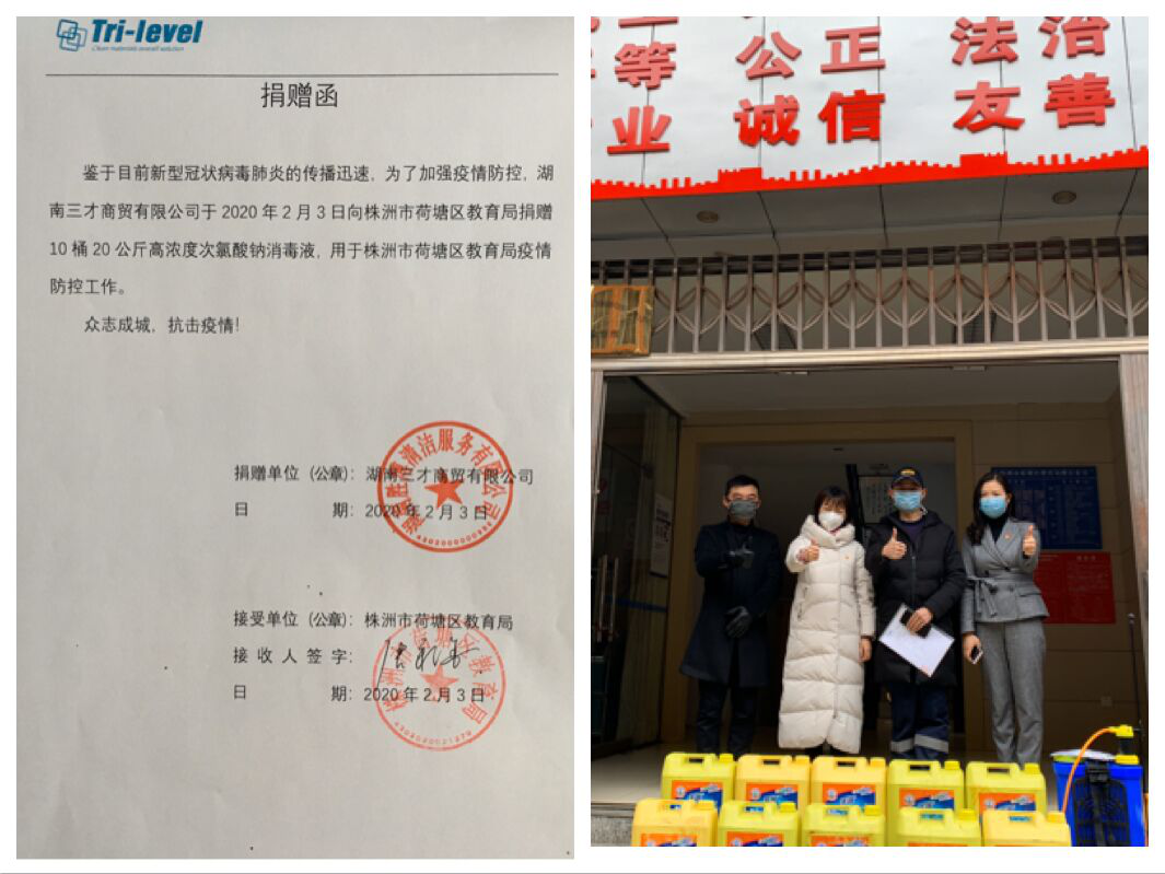 2月3日,湖南三才商贸有限公司工作人员将200公斤专业消杀药水、配备的喷洒器具,捐赠给荷塘区教育局。