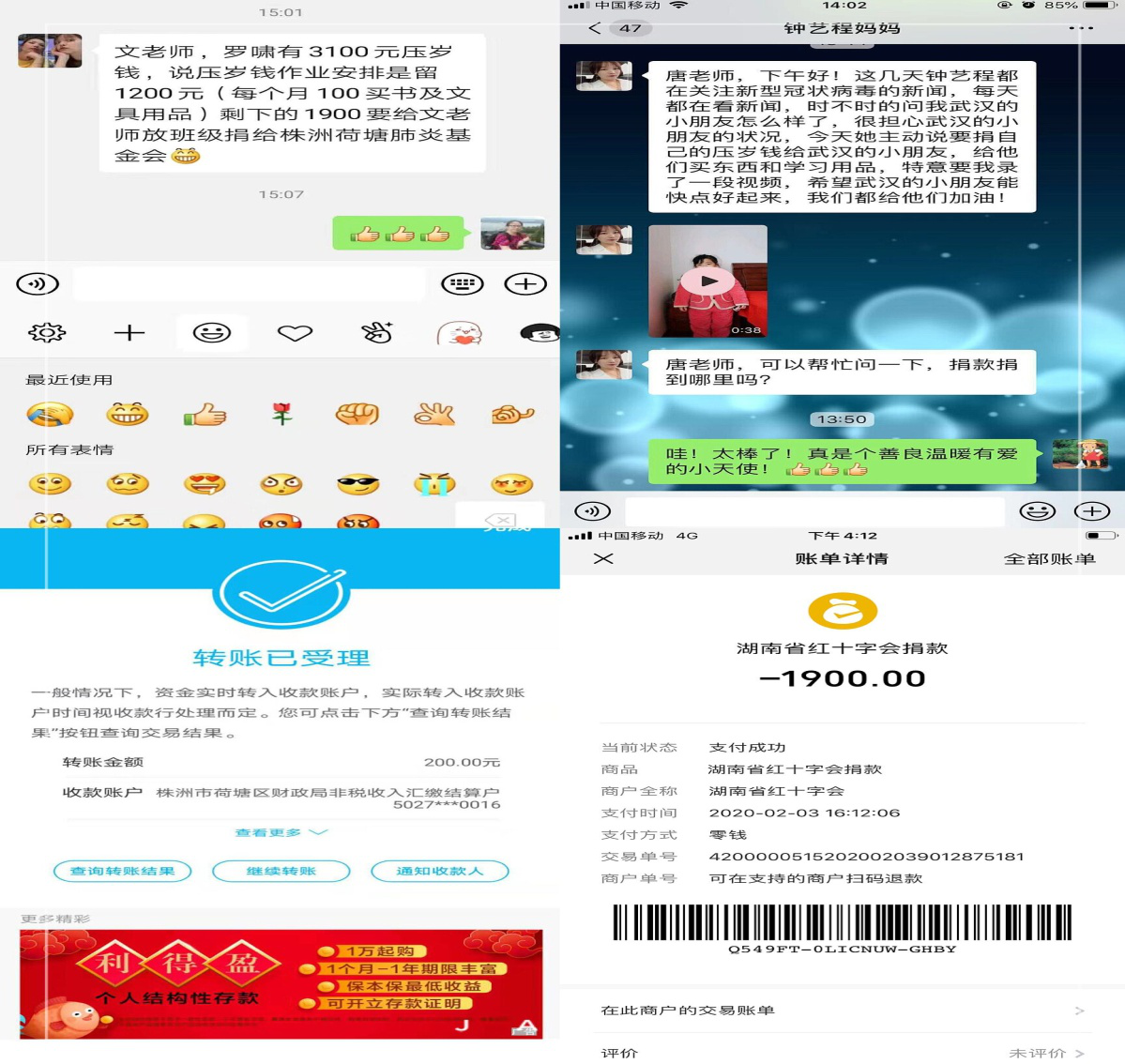 “我们都为武汉加油!希望武汉好起来!”荷塘小学1904班的钟艺程、1602班的罗啸等同学,每天都关注新闻,防疫物资紧缺、抗疫形势严峻......无时无刻不牵挂着荷塘学子的心。罗啸的春节压岁钱仅预留课外书和文具用品费用,将剩下的1900元全部捐给了湖南省红十字会。钟艺程也捐出自己的压岁钱,说要给武汉小朋友用来买东西买学习用品。