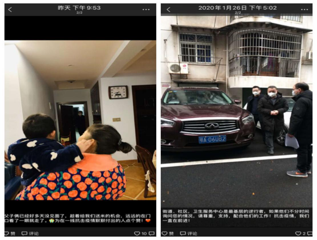 荷塘小学教研主任唐晓瑾,丈夫是宋家桥街道办事处的一名党员干部。从疫情出现的那天开始,丈夫取消假期不分昼夜对辖区内的居民进行地毯式排查。因为排查工作每天接触了很多人,丈夫担心自己感染病毒,一直没敢回家和家人团聚,送生活物资回家也只能远远地望一眼忙碌的妻子和年幼的儿子。唐晓瑾既心疼丈夫又为他感到骄傲:“每一个人心中都有两个家,一个是小家,另一个是大家。舍小家,为大家,我愿意做逆行丈夫背后的女人。待到春暖花开、山花烂漫时,一定带着家人,笑迎凯旋!”