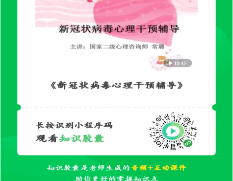 关爱学生有温度。成立专兼职心理教师疫病防控心理干预志愿者队伍,志愿者们在网络上开展了工作研讨,针对本次新型冠状病毒感染的肺炎疫情,结合我区学生及家长特点设计了心理干预辅导课程,制作了微课视频,并通过QQ、微信平台发送给学生和家长。志愿者们时刻关注学生及家庭成员的心理动态,必要时提供一对一的心理疏导。