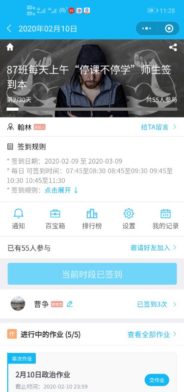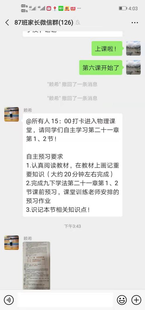 自2月10日起,针对初三和初二的毕业学科,学科组指导学生制定了学习计划,有针对性的安排了教学任务。采用签到程序,推送学习指导,方便快捷,利用QQ及微信组建学习群,在群内就学习内容进行讨论和答疑,提高了学习效率。特别是化学科,老师们精心制作了微课视频,推送给同学们,让同学们更直观的学习,清楚的看到实验过程,效果显著。科任老师还通过群内讨论、查看后台作业情况,对一天的学习进行总结,汇总到学科组,以便开展第二天的教学。
