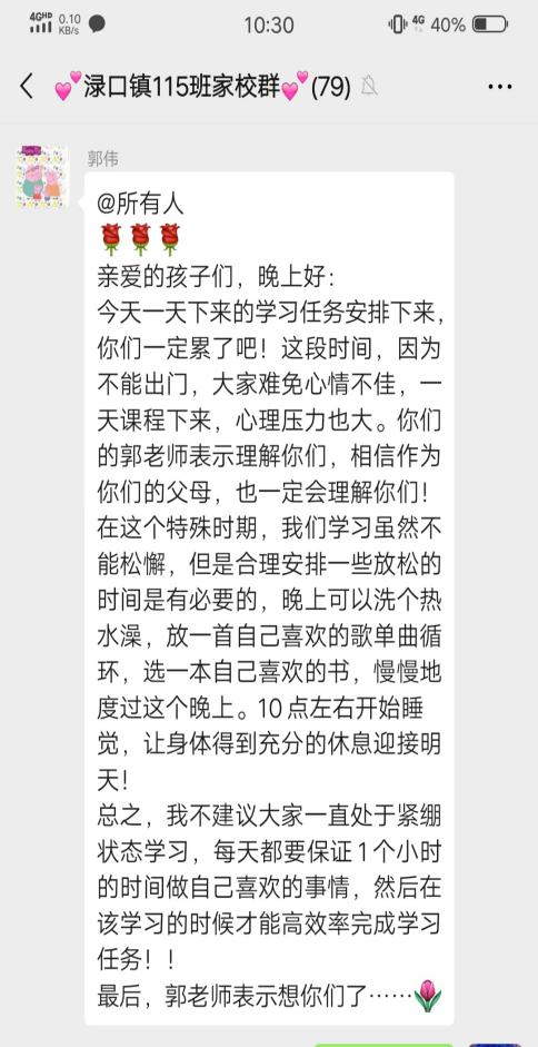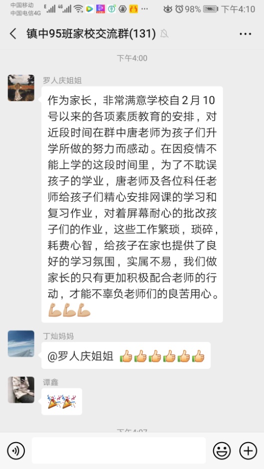 在防疫期间,学校积极应对,指导学生养成良好的学习习惯,关注学生的身体状况和心理健康,利用线上交流,拉近与学生、家长的距离,体现了学校的当担和责任。学校的做法,得到了家长的支持和好评。我们也会一如既往的做好学校工作,在这特殊的日子里,和学生一起停课不停学,不见面也和学生一起成长。