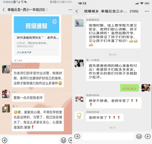 一天的课程结束后,家长和孩子们纷纷感谢老师们的辛苦劳动,也积极发表自己的感受。三搭桥小学六年级钟敬腾妈妈说:“疫情时期,线上教学既方便又安全,老师们耐心讲解,孩子们认真倾听!虽然延期开学,但是这样的教学方式既保证了学生的安全,又能让孩子们学到丰富的知识!”