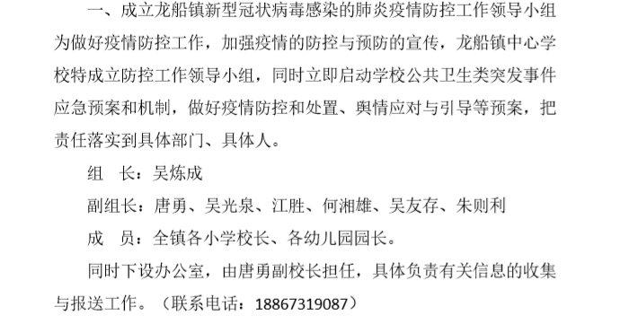 龙船镇中心学校新型冠状病毒感染的肺炎疫情防控领导小组迅速动员、马上行动,多次召开专题会议,研究部署学校疫情防控工作。