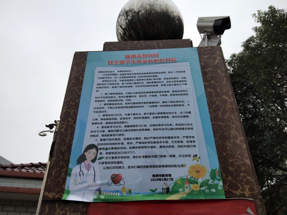 根据区教育局通知要求,各校党员同志走在第一线,悬挂防疫宣传横幅、张贴《株洲市新型冠状病毒感染的肺炎防控工作领导小组3号令》、《株洲市教育局致全体学生及家长的公开信》